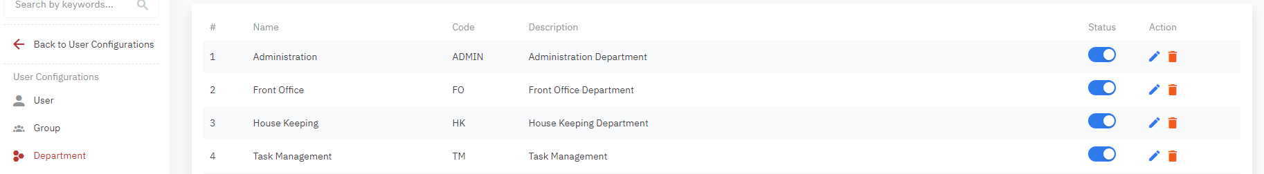 Select “Create” and enter the following information: ![]() (1) Name: Name of the department (2) Code: Code of the department (3) Description: Description of the department (4) Status: On/Off (5) Select Submit to save the department or Back to cancel the action. |