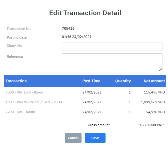 Log in – Front Office – Reservation – Confirmation Detail – Billing – Open “…“ menu - Select “Edit transaction detail“![]() |