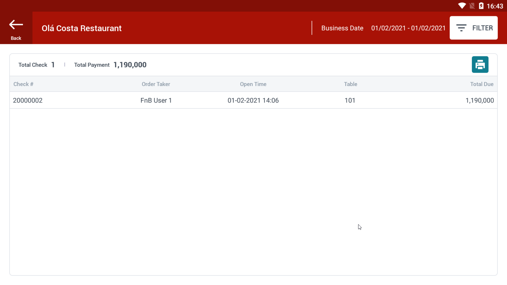 Filter: Outlet: Select outlet Employee: Select cashier Business Date: Select date range Start Date Time: Select Start Date Time (system date) End Date Time: Select end date time (system date) Report Fields: Check number Status Open Time Close Time Table number Tender Payment Total Check Total Payment ![]() Click this button to print report |