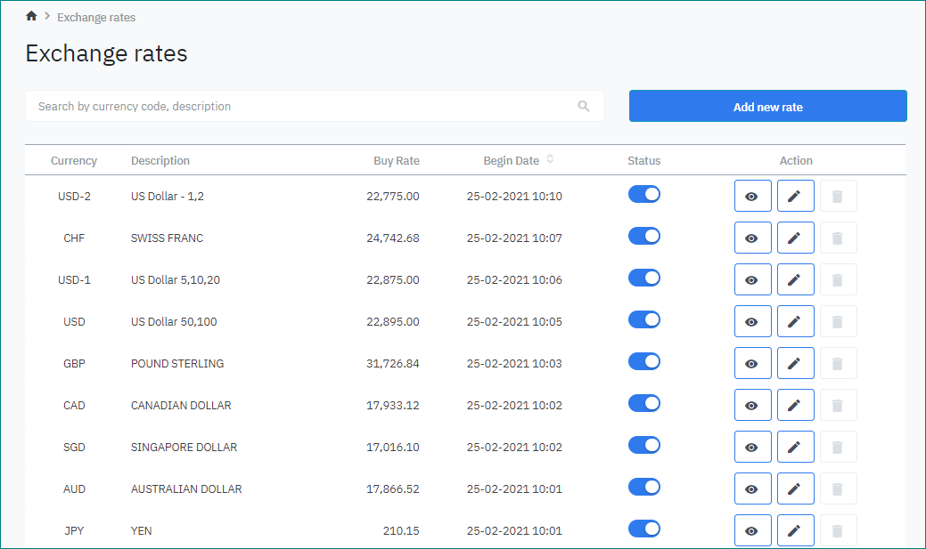 The screen allows you to add or update the exchange rates of a currency. |