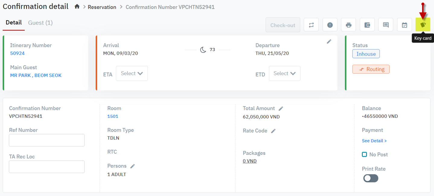 The system provides 3 separate ways to grant key cards for guests: 1. [Key Card] - Grant Card directly from the Confirmation Detail screenGo to the Confirmation Detail screen and select “Key Card” button.![]() ![]()