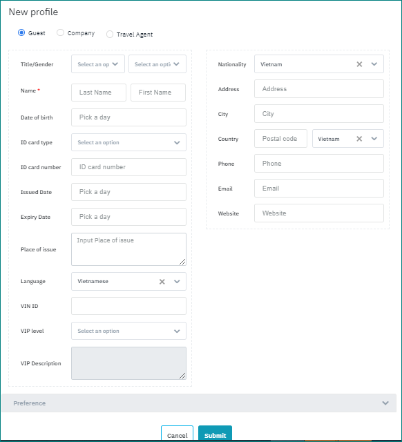 The New Profile screen allows you to add a new profile. The screen differs depending on the type of profile you are selecting (Guest/Company/Travel Agent). |