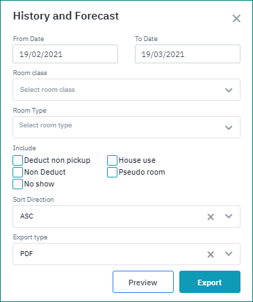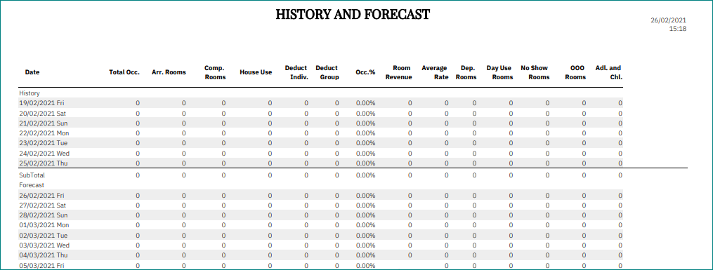The report provides the past reservation activities and the reservations that are anticipated in the future, including individual guests, group reservations, occupancy, average room rate as well as total revenue in the past and in the future. The report’s output is divided into 2 parts: Statistical data and Forecast data. |