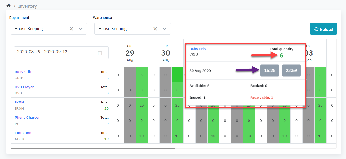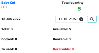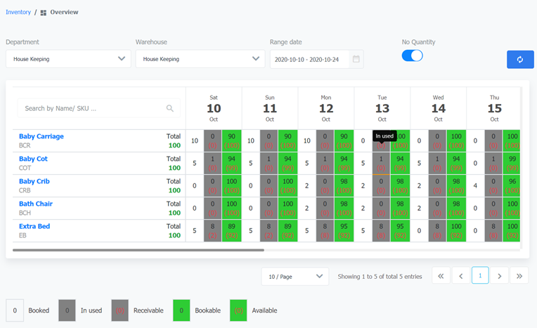 ![]() Total: Total of the items in the store Available = Total - In Used Booked: Number of items that are booked Bookable (ready to book) = Total - Booked - Inused + Receivable (or Bookable = available + receivable - booked) Inused: Number of items that are in used Receivable: Number of returned items (always <= In used)