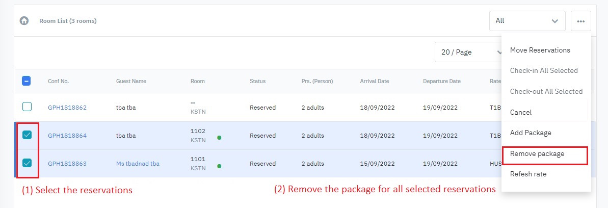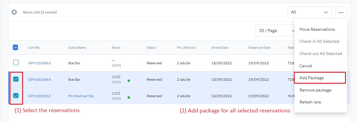 (5) Add Package: Add package to the selected reservations.