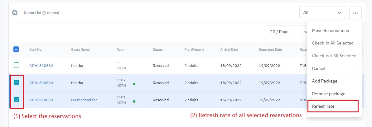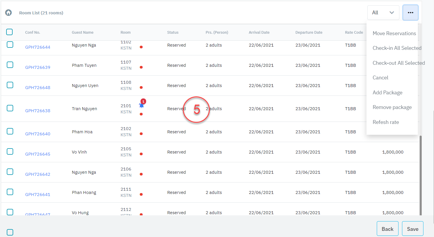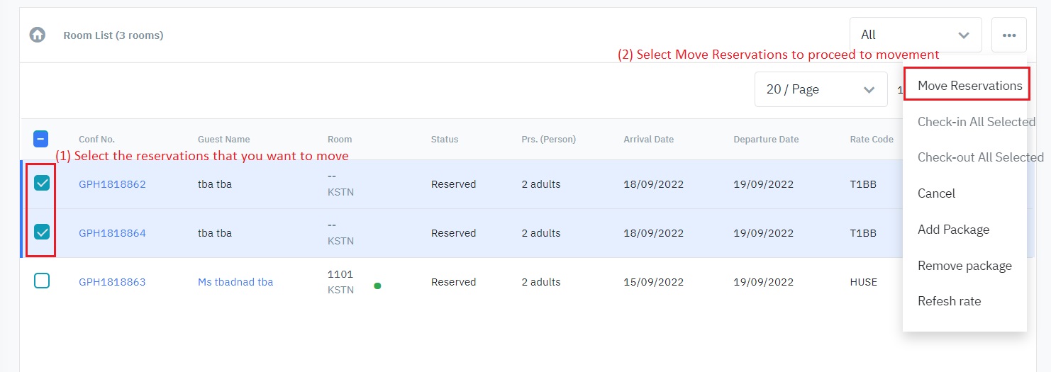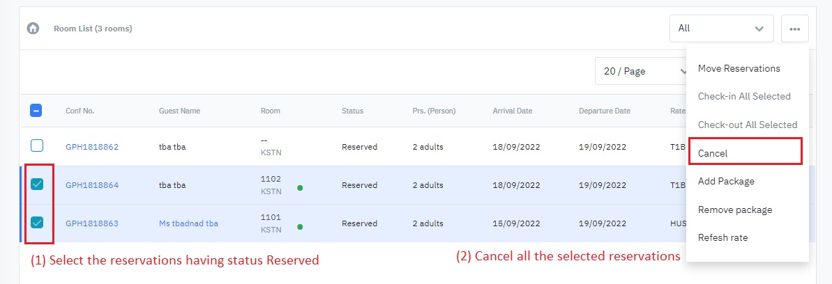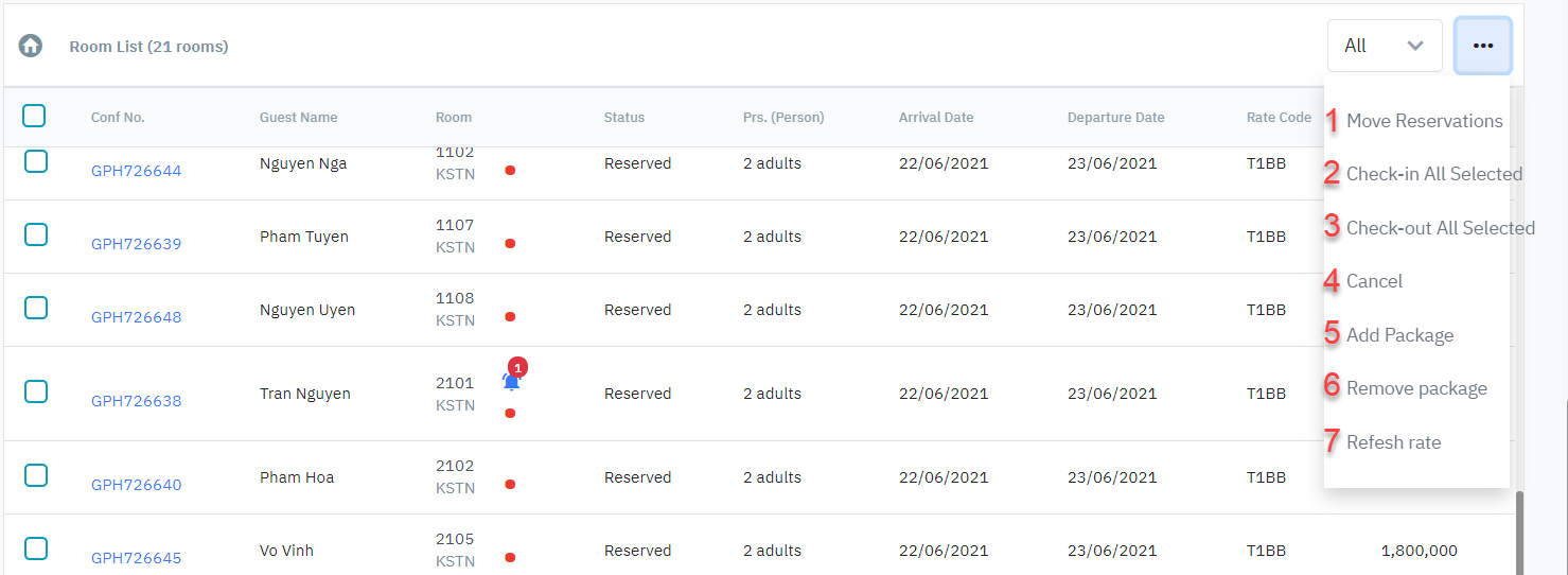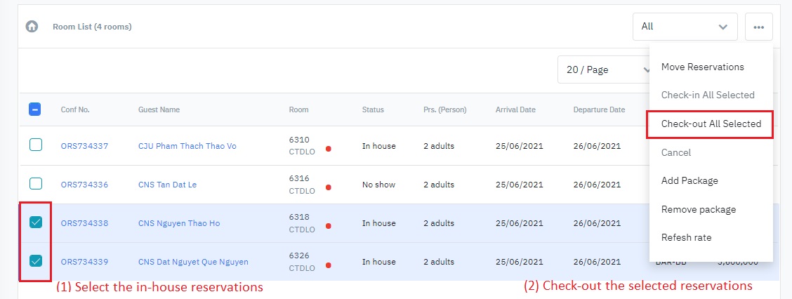 (3)Check-out All Selected: Check out all the selected reservations (only enabled when the selected reservations have the status In House).