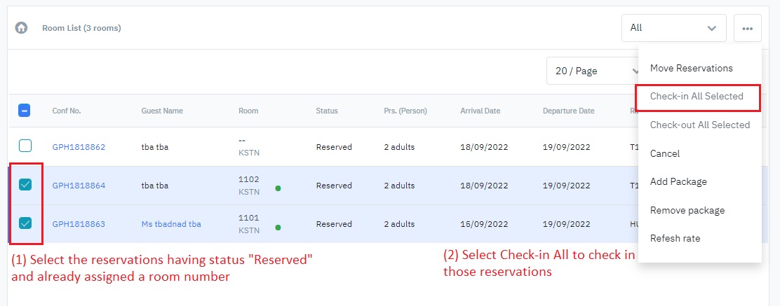 (2)Check-in All Selected: Check in all the selected reservations (only enabled when the selected reservations have the status Reserved and have been already assigned a room).