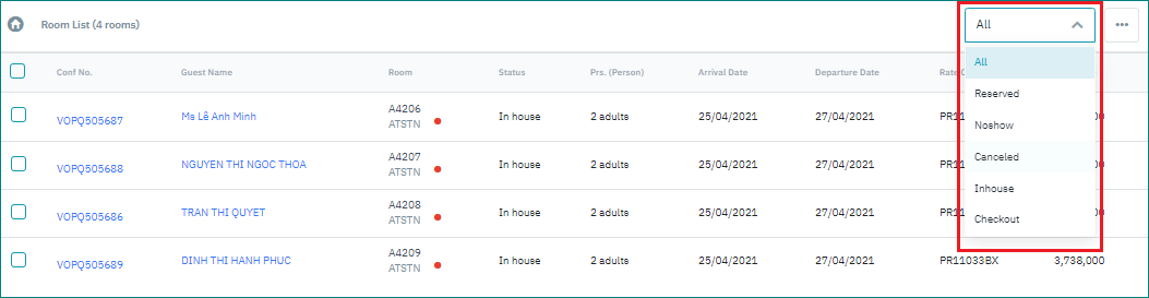 Filter the rooming list by the reservation status (Reserved, No Show, Canceled, In-house, Checkout).