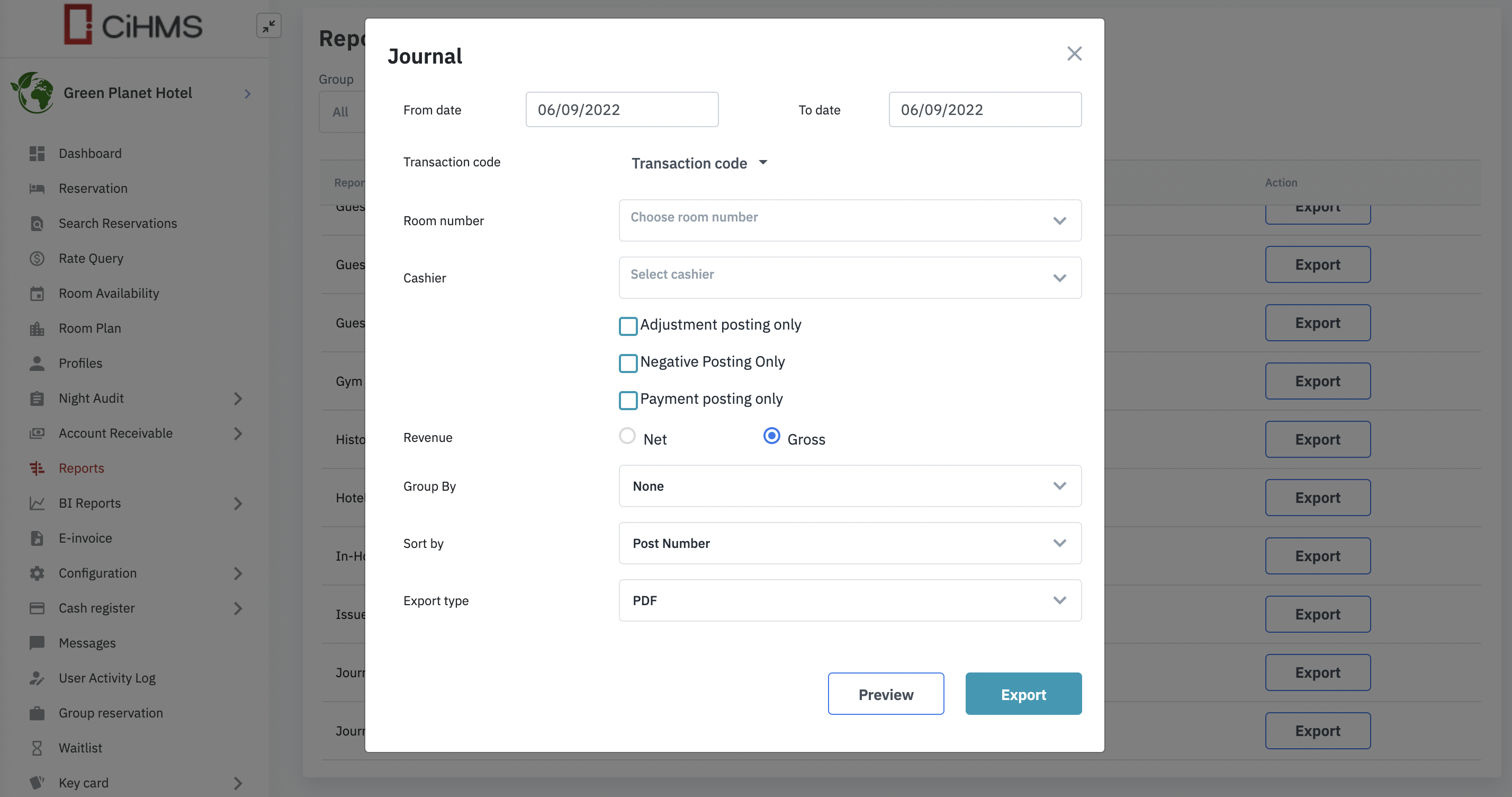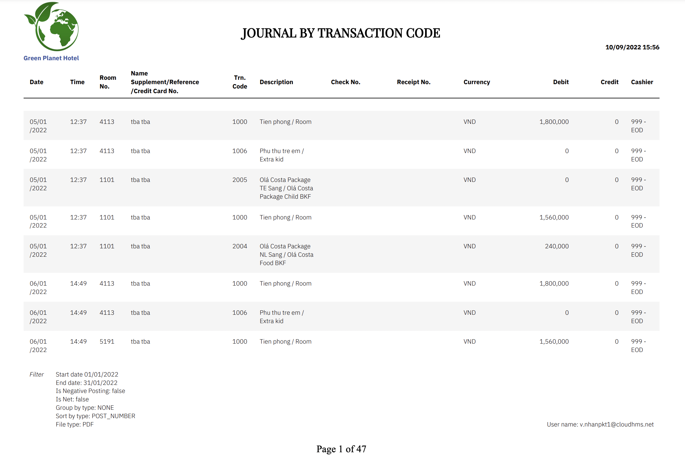 The report lists all the incurred transactions by transaction code, date, cashier and by room. |