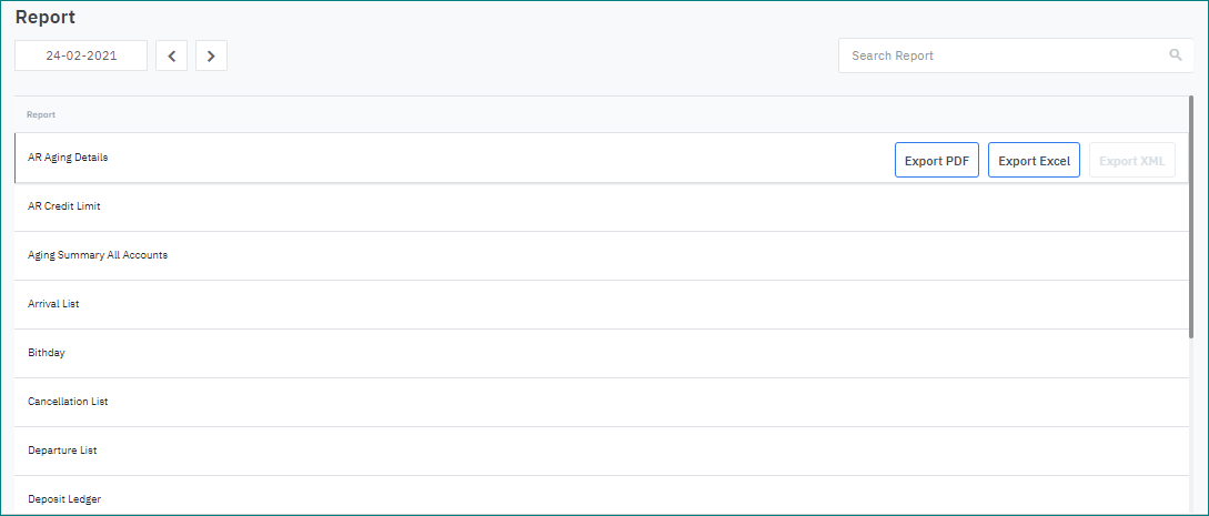 Hover the report and select “Export PDF“ or “Export Excel“ to download the report. You can also search for a report by the name or select a date to list out the reports running for this business date. |