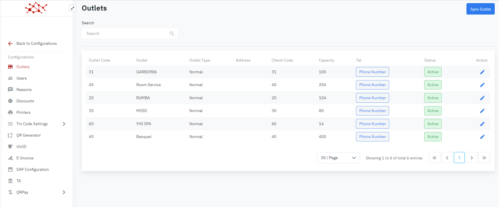 Sync OutletSynchronize the information of outlets in the Property Management module List of outlet is made of by following sections: