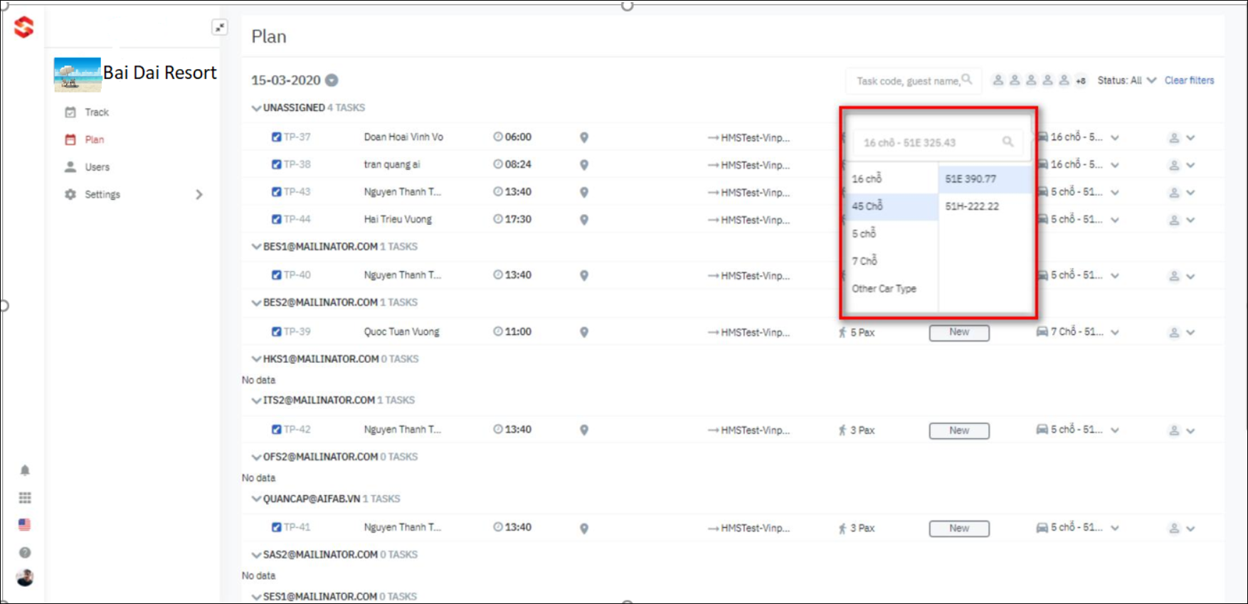 o Corresponding to each type of vehicle such as 4 seats, 7 seats will be accompanied by a list of vehicles by license plate to choose from.