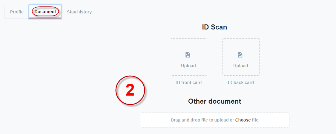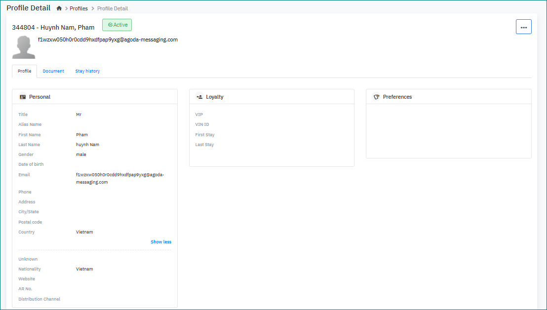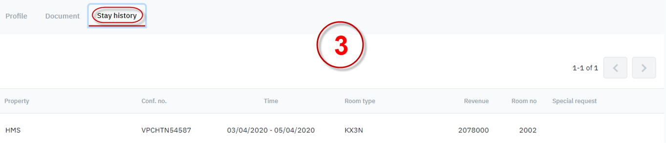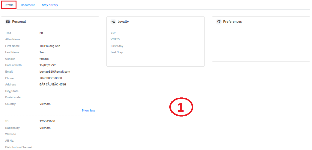 [Preference] - Preferences of guestThis section is only enabled for individual guest profiles. For example: Interests, Allergy, Belief, Room Features… [Tab Document] - Attachment documents (2)You can upload the document (for example: ID/Passport/License…) by drag and drop or choose the file from the computer. ![]() [Tab Stay History] - History of guest’s stay (3)![]()