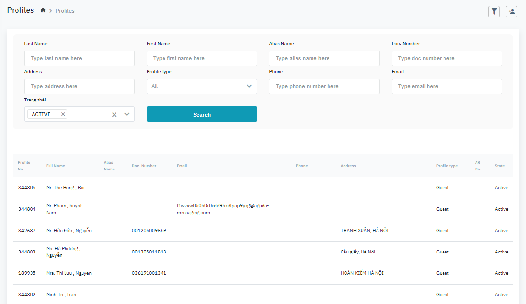 The Profiles screen allows you to search the profile for guests (including individual guests, company, and travel agent) following the search criteria. |