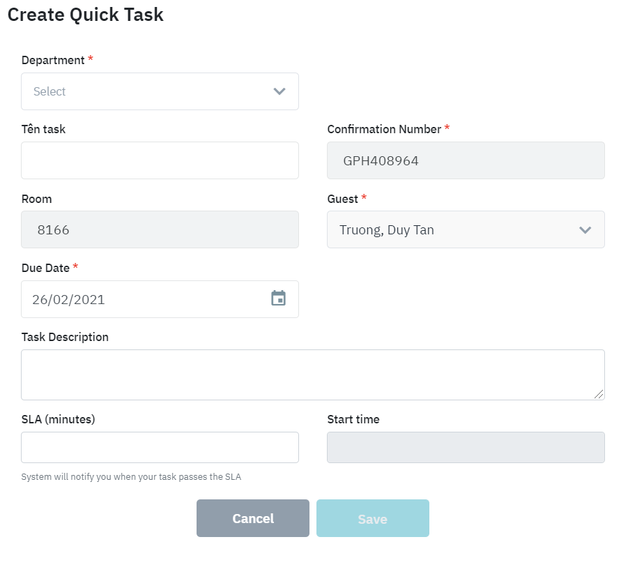 The Quick Tasks allows you to manage the internal tasks/requests from the guests. The tasks that are created from this screen will be linked to the Task Management application. |