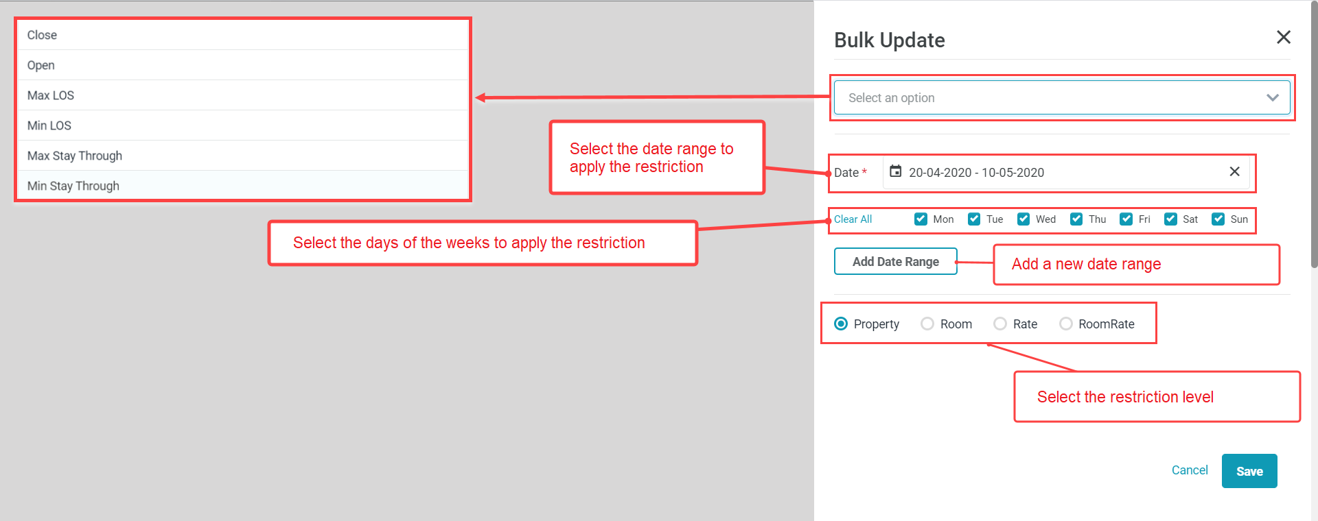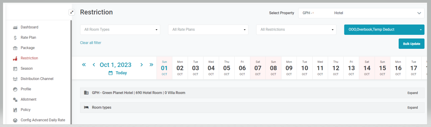 Set Restriction by Room Type![]() Set Restriction by Rate Plan![]() Bulk update restriction ![]() ![]() |