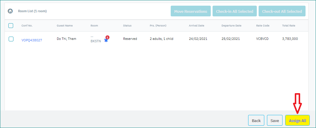 After successfully assigned the room, the reservation in the Tab “Unassigned” will be automatically moved to the Tab “Arrival” |