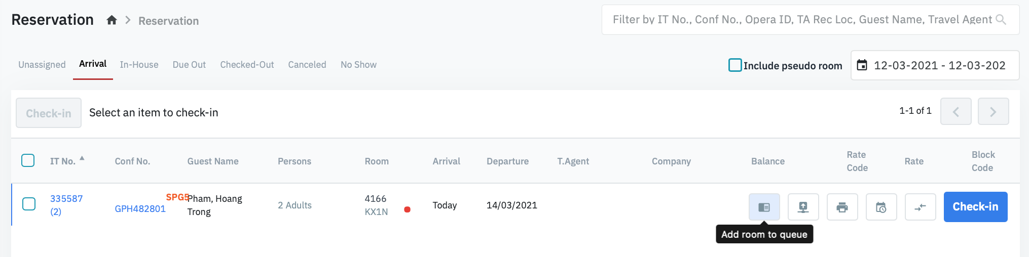 Add a room to the queueAt the screen Reservation, tab Arrival, hover the mouse on the room that you want to add in the queue and select Add room to queue, select Confirm. ![]() ![]() For the rooms that are already added to the queue, this icon will be disabled. ![]() Search for a room in the queueSelect the filter to display the available filter for search ![]() You can search for the room by the following criteria: ![]()