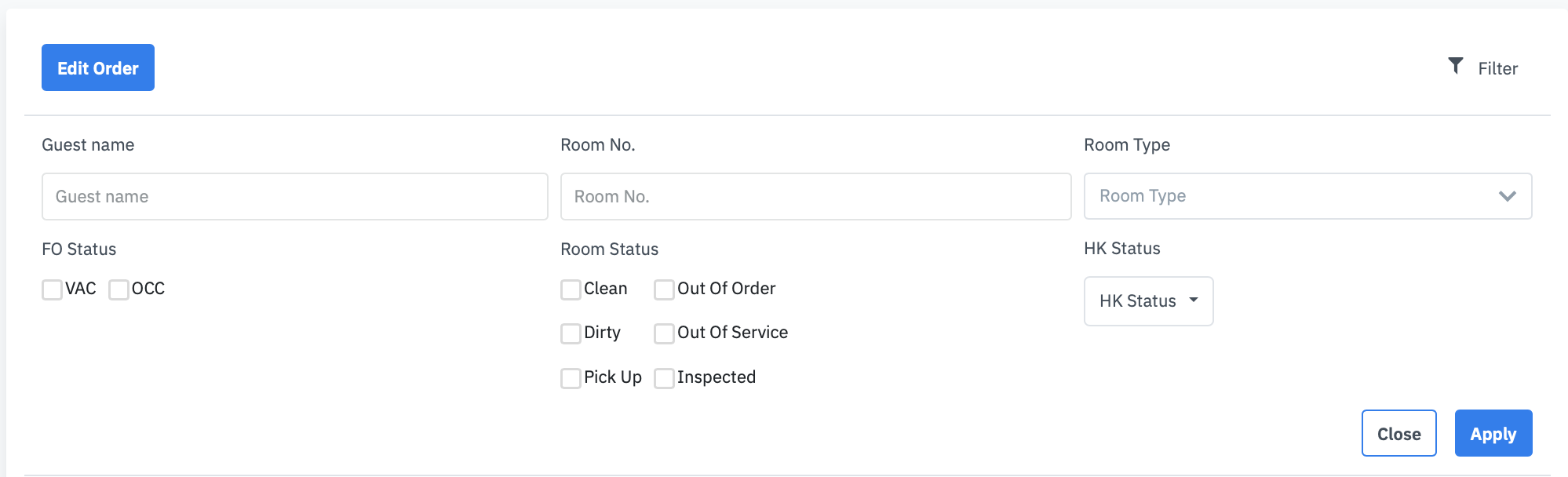 Select Apply to proceed with the search. Edit Order of a roomSelect Edit Order button to reorder the list of room queue ![]() ![]() List of the rooms in the queue![]()