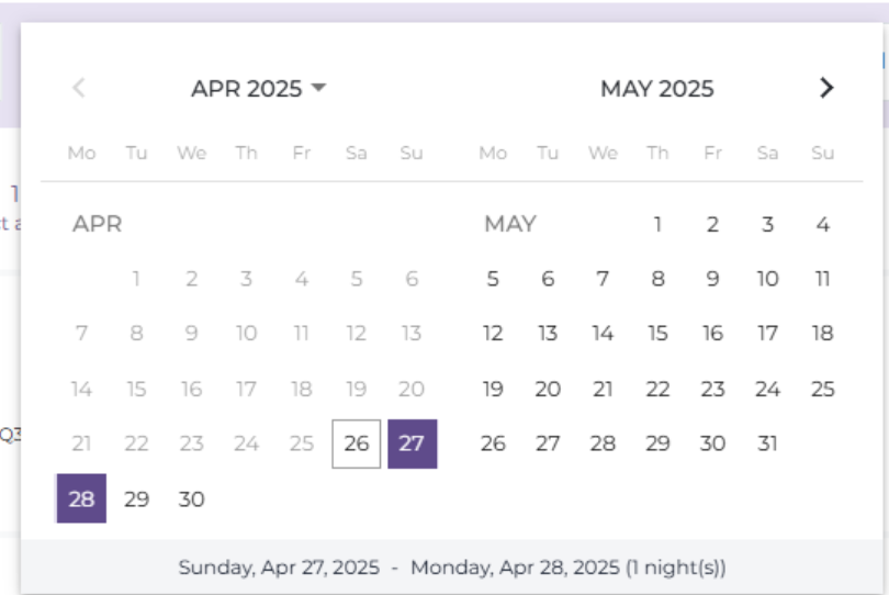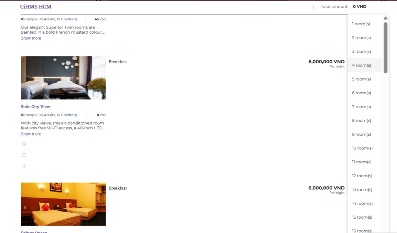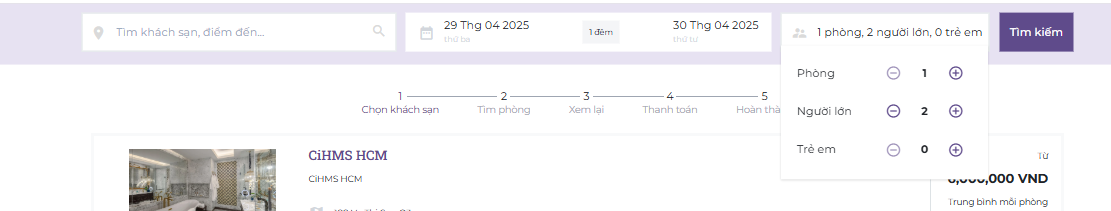 (2) Select the stay period based on the type of room — by the hour, by the day, or by the month. ![]() (3) Select the number of rooms and guests for the booking. Use the :plus: or :minus: icons to increase or decrease the number of rooms or guests ![]() Finally, select 'Search' to view the results ![]() After selecting 'Search', the system will display a 'Promo Code' field where you can enter a promo code (if any). ![]() II. Booking Steps