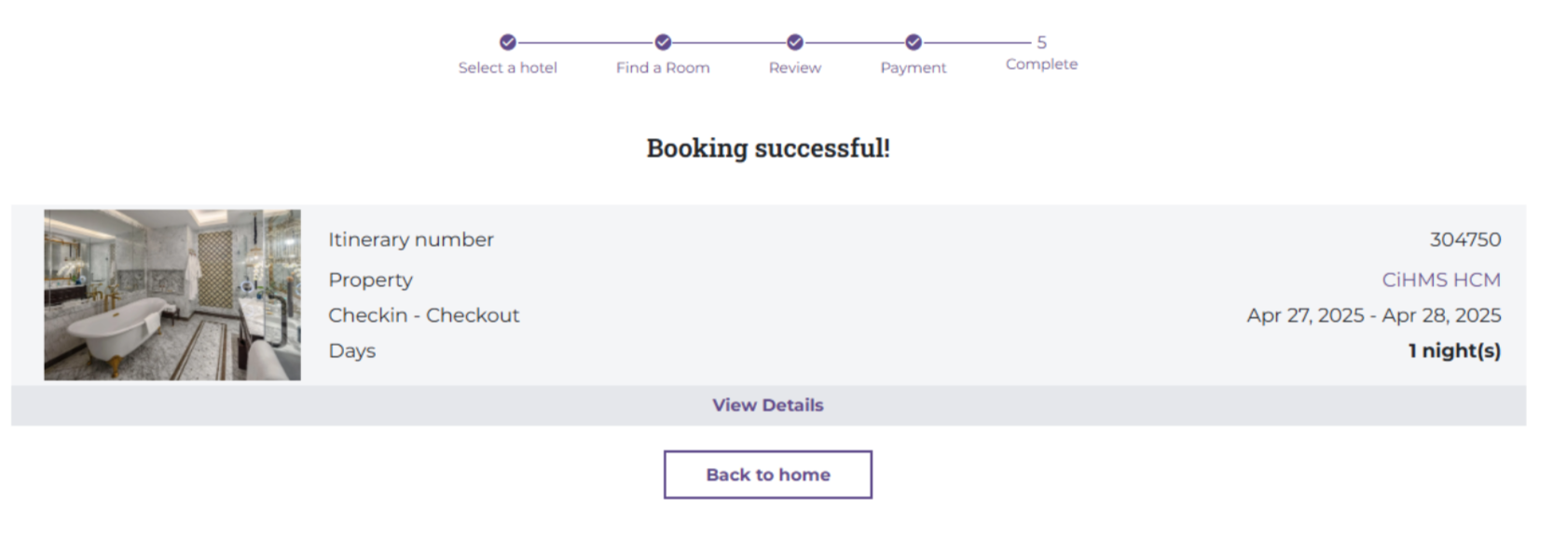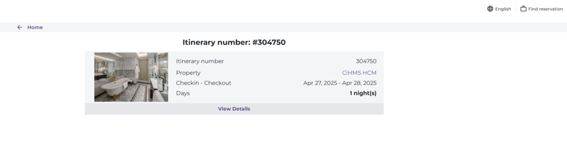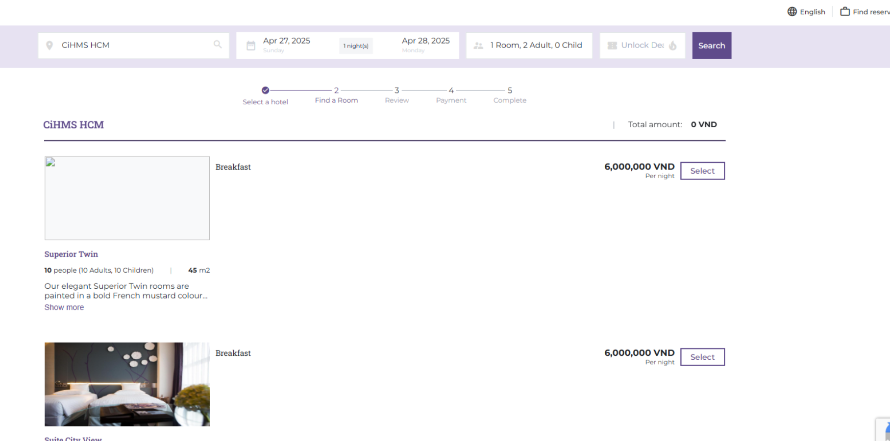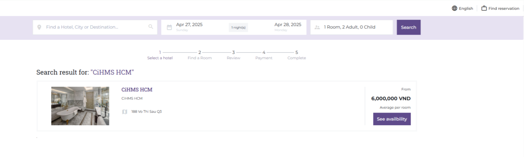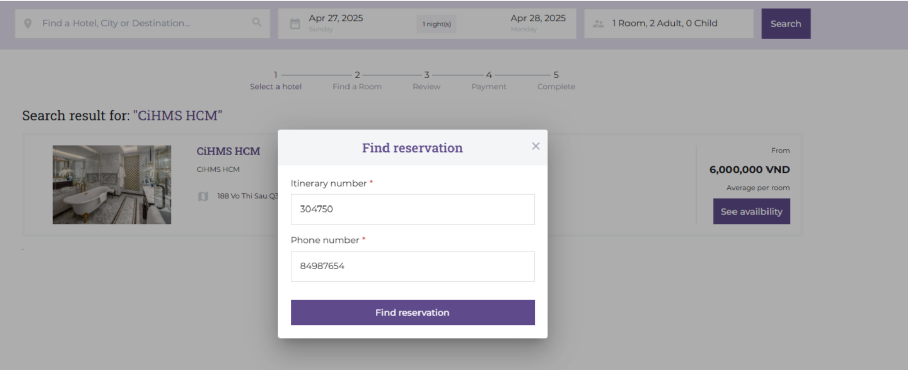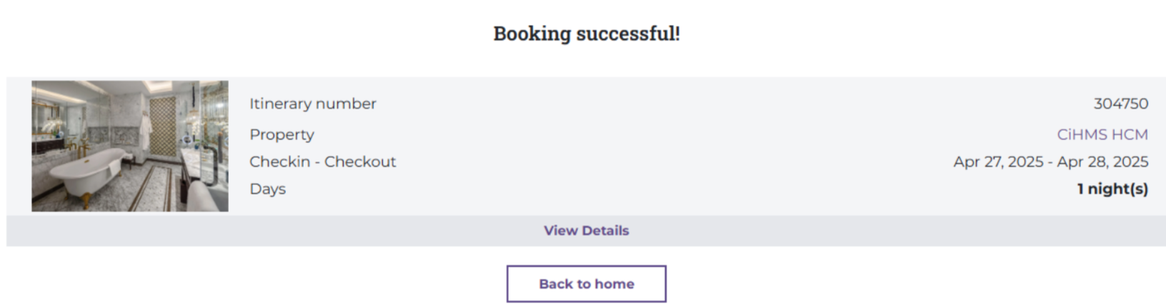 (3) Add Guests: Select 'Add Guest' when the room is for two or more people. ![]() (4) The user needs to review the Cancellation Policy before proceeding to Payment. (5) Special Requests: If the guest has any special requests, the user should enter the information in the personal request section. Additionally, select the Promo Code section if the customer has a discount code for the room. ![]() Step 3. Review: The user needs to review the booking information before proceeding to payment. ![]() (1) Review the booking information. (2) Select a payment method: Pay directly at the hotel. Finally, select 'Complete Booking' to proceed to the Payment step. Step 4. Payment: After the user has chosen a payment method in Step 3 Once the payment is complete, the system will proceed to Step 5. ![]() Step 5. Completion: After the booking is complete, the system will send a confirmation email containing the booking code and the guest's itinerary code. ![]() III. Find a Room ![]() On the homepage, select 'Find a Room' to search for the bookings the user has made. ![]() Enter the itinerary code and phone number to search for the booking. ![]() |