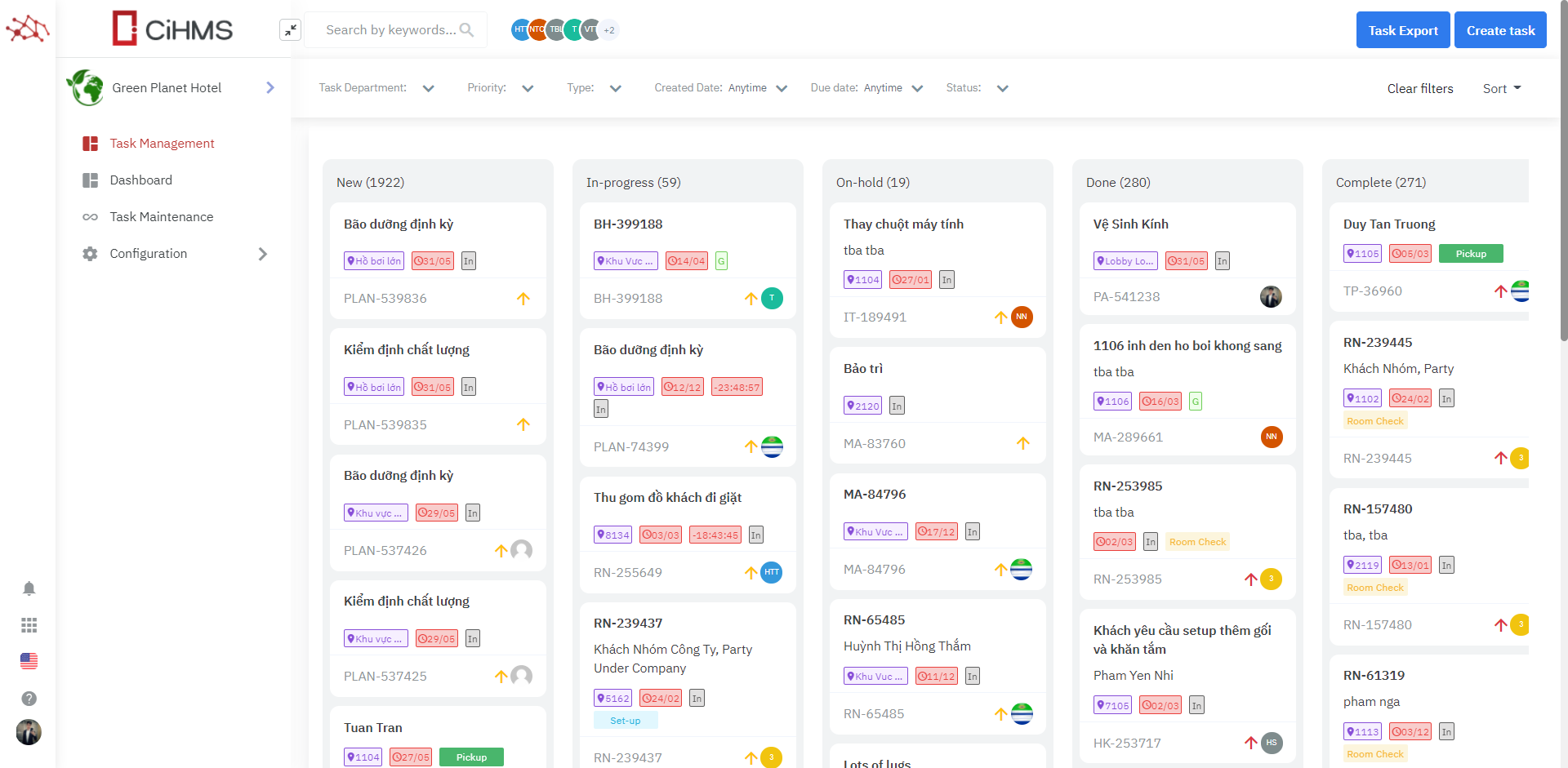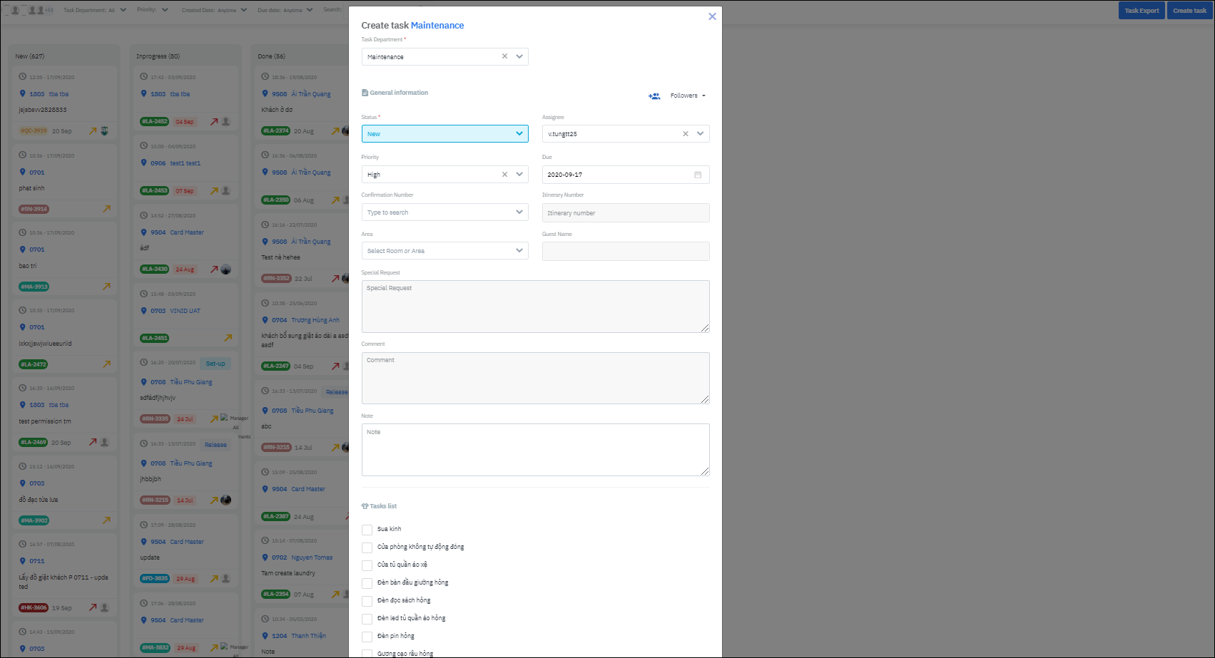 The screen allows you to create and manage the internal tasks between different departments in the hotel. You can both manage the tasks list from the UI and export the related report. |