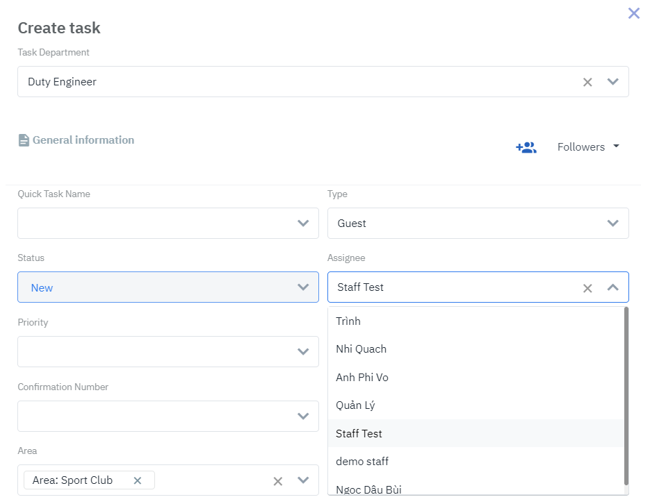 Assignee: Select from the Staff list of values. See [Eng] Department Management for how to configure the list of staff in a department. |