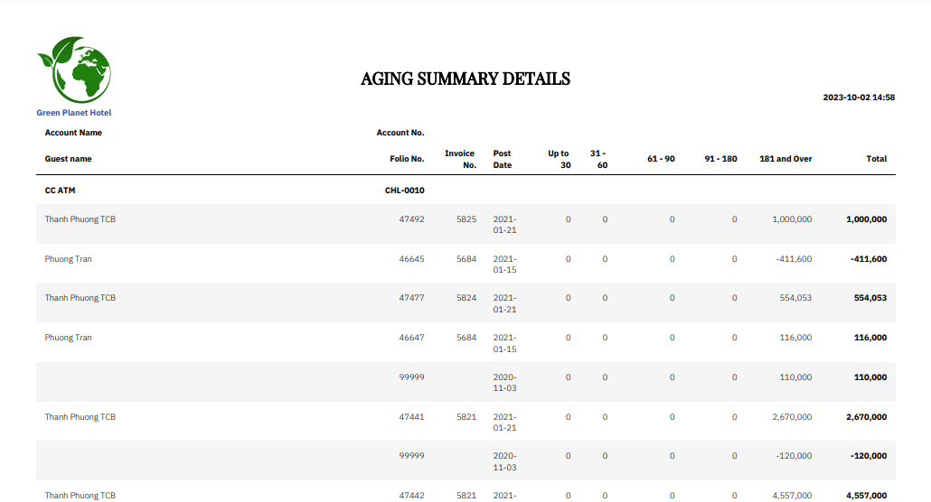 ស្ថិតិលម្អិតនៃបំណុលបែងចែកតាមអាយុបំណុលរបស់ភ្ញៀវ. របាយការណ៍គឺផ្អែកលើកាលបរិច្ឆេទជាក់ស្តែងនៃបំណុលដែលកើតឡើង និងកាលបរិច្ឆេទនៃការមើលរបាយការណ៍ដើម្បីគណនាអាយុបំណុល។ |