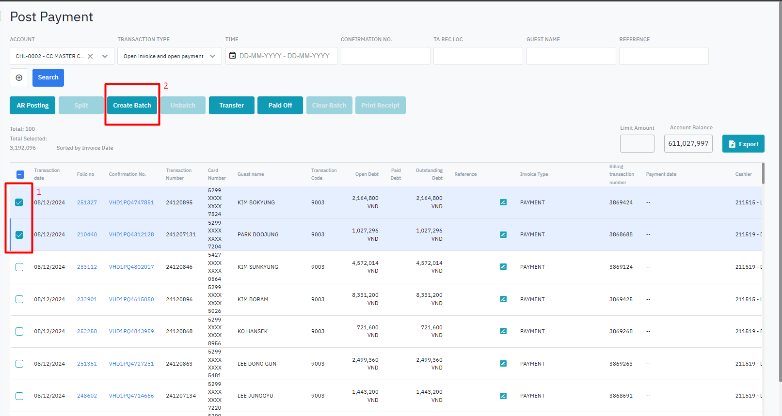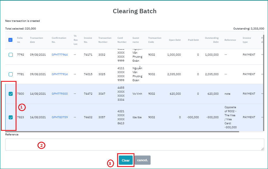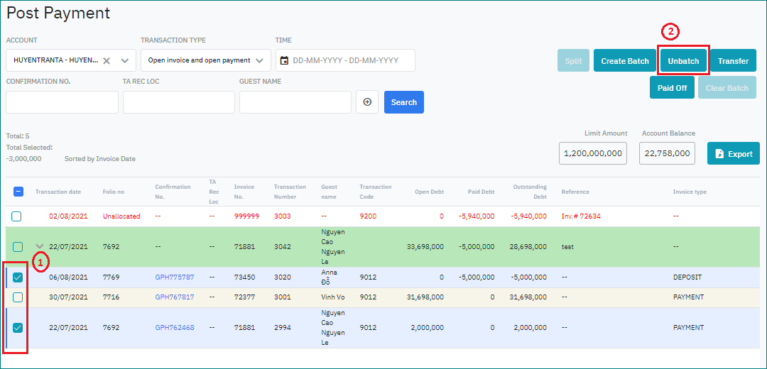 ជំហាន 1: នៅលើអេក្រង់ Post Payment ស្វែងរកគណនីដែលចង់ដាក់បំណុលជាក្រុម ជំហាន 2: ចុច “Create Batch” ![]() ជំហាន 3: បញ្ចូលព័ត៌មានចំណាំសម្រាប់ប្រតិបត្តិការ ជំហាន 4: ចុច “Submit” ![]() ប្រព័ន្ធនឹងបង្កើតបញ្ជីបំណុលសរុបដោយស្វ័យប្រវត្តិជាមួយនឹងព័ត៌មានបំណុលដែលជាចំនួនសរុបនៃប្រតិបត្តិការបំណុលដែលបានជ្រើសរើស Unbatch- បំបែកប្រតិបត្តិការដាច់ដោយឡែកដែលត្រូវបានដាក់ជាក្រុមបំណុលជំហាន 1: នៅលើអេក្រង់ Post Payment ជ្រើសរើសប្រតិបត្តិការជាក្រុម 1 ឬច្រើន 1 batch ជំហាន 2: ចុច “Unbatch” ដើម្បីបំបែកប្រតិបត្តិការដែលបានជ្រើសរើសចេញពី batch. ប្រតិបត្តិការបំបែកចេញពី batch បានដាក់នៅជិត batch ហើយមានទីតាំងនៅជួរទីមួយនៃអេក្រង់ ![]() ឧទាហរណ៍ 1: នៅក្នុងក្រុមមាន3នៃប្រតិបត្តិការជ្រើសរើស 1 ប្រតិបត្តិការ → unbatch, ជាលទ្ធផល ប្រតិបត្តិការនោះនឹងផ្លាស់ទីចេញពី batch ដោយទុកឱ្យប្រតិបត្តិការ 2 ដែលនៅសល់នៅខាងក្នុង batch Clear Batch- លុបប្រតិបត្តិការបំណុលនៅក្នុងក្រុមបំណុលជំហាន 1: នៅអេក្រង់ Post Payment, ជ្រើសរើស 1 batch ដើម្បីលុបប្រតិបត្តិការបំណុល ជំហាន 2: ចុច “Clear Batch” ![]() ជំហាន 3: នៅអេក្រង់ Clearing Batch សូមជ្រើសរើសប្រតិបត្តិការបំណុល 1 ឬច្រើននៅក្នុង batch ដែលត្រូវជម្រះ (1) បន្ទាប់មកបញ្ចូលកំណត់ចំណាំដែលទាក់ទង (2) កំណត់ចំណាំនេះនឹងត្រូវបានកត់ត្រានៅក្នុងប្រតិបត្តិការដែលទាក់ទងនឹងការ Clear batch ជ្រើសរើស Clear ដើម្បីប្រតិបត្តិការ (3) ។ ![]() |