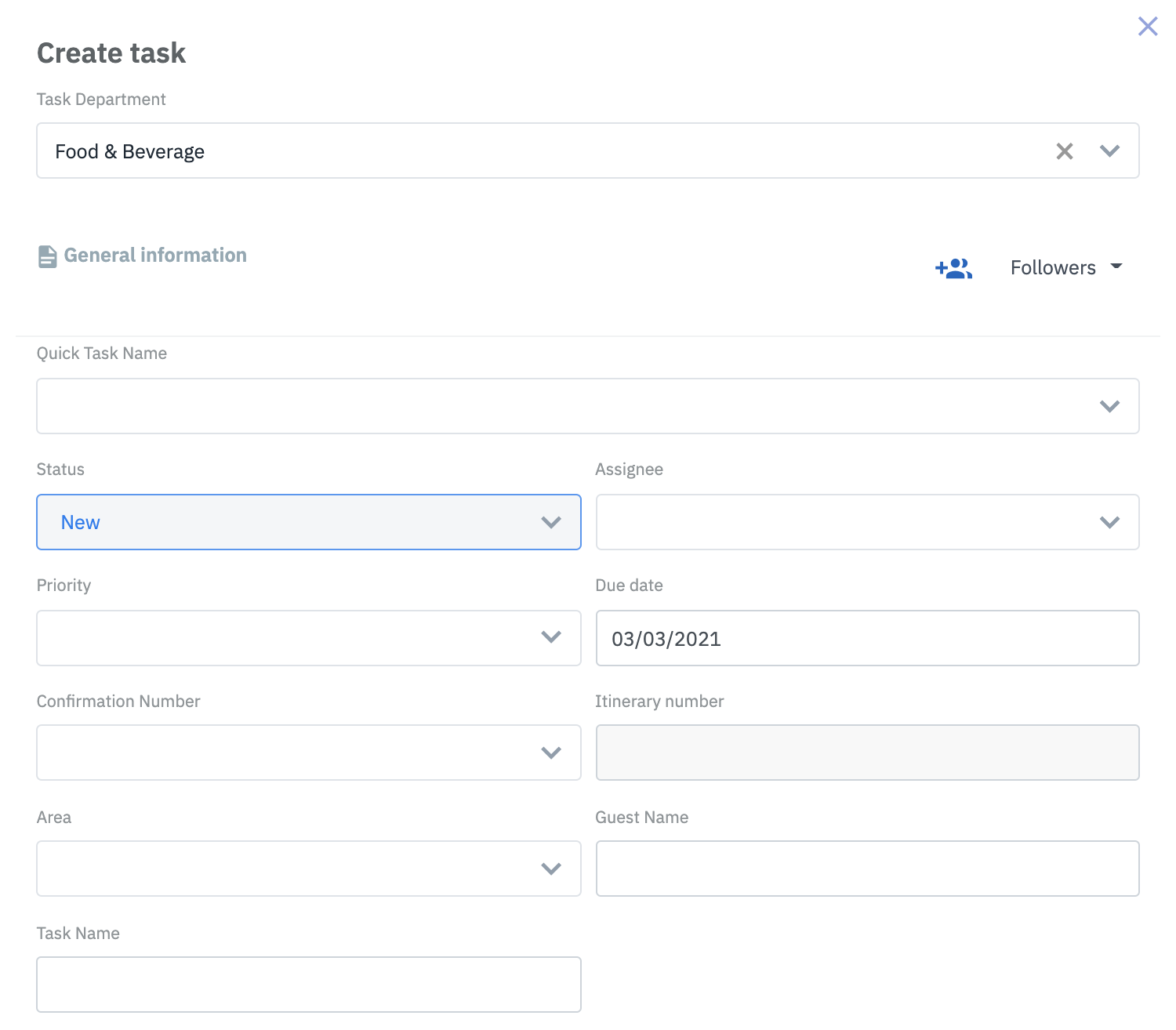 អ្នកទទួល/ Assignee: អ្នកបង្កើតអាចទុកឱ្យនៅទទេ ឬជ្រើសរើសអ្នកបញ្ជាក់ស្របតាមតម្រូវការការងារ ប្រសិនបើទុកកន្លែងទំនេរ អ្នកពិនិត្យ ឬអ្នកគ្រប់គ្រងនឹងទទួលខុសត្រូវលើការចាត់តាំងការងារទៅឱ្យបុគ្គលិកសមស្រប ដើម្បីធានាថាការងារនោះបានអនុវត្ត. ភារកិច្ចរៀបចំព្រឹត្តិការណ៍សម្រាប់ភ្ញៀវម្នាក់ៗជារឿយៗត្រូវបានចាត់តាំងឱ្យបុគ្គលិកទទួលបន្ទុក Room Service របស់ផ្នែក F&B និង Runner, Florist របស់ផ្នែក Housekeeping.