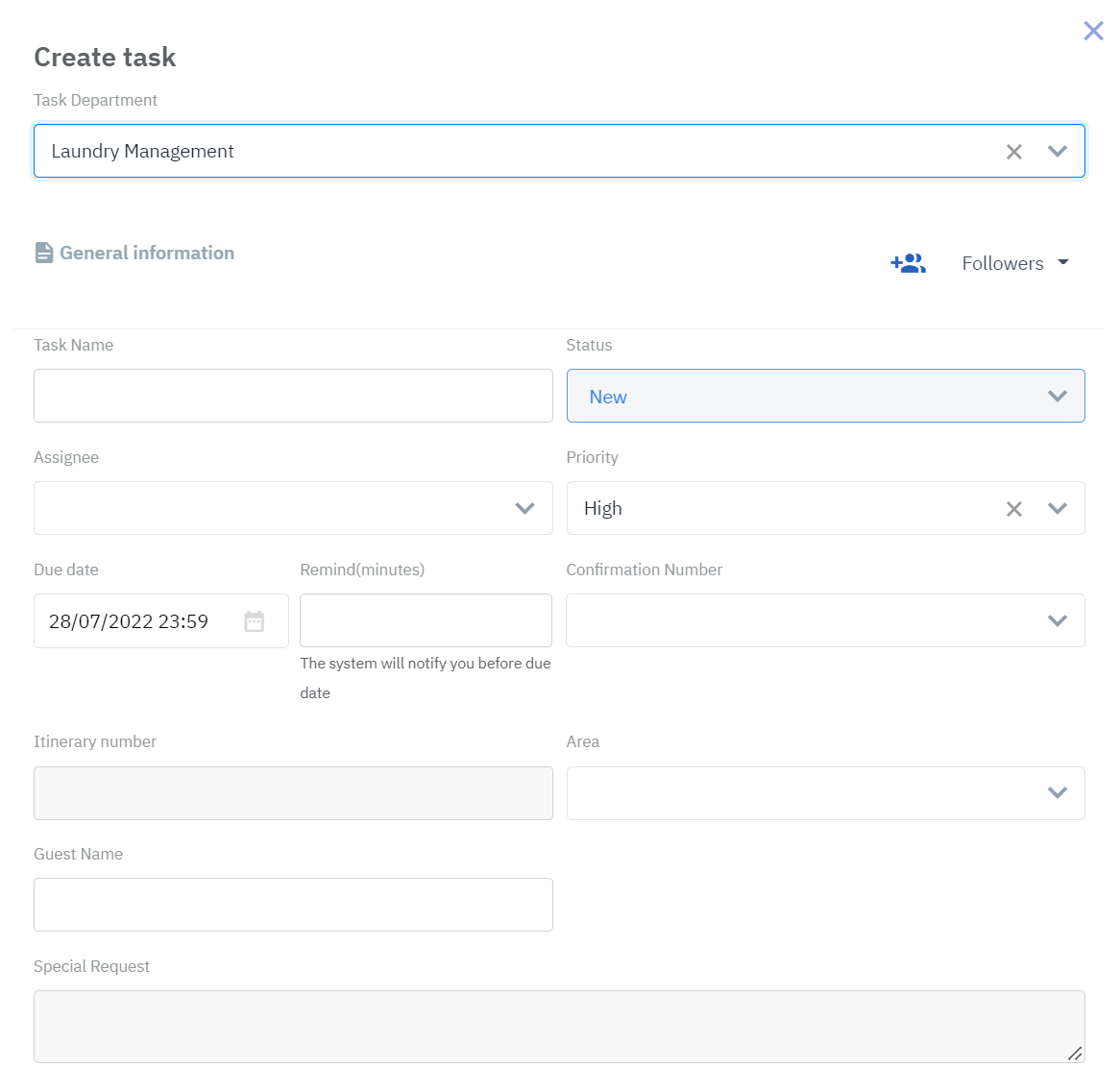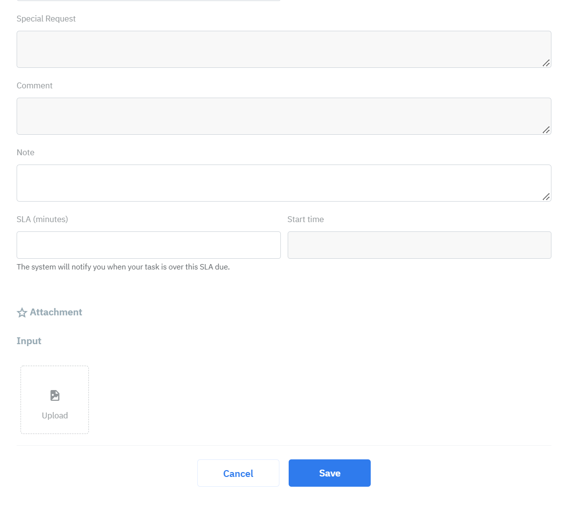 SLA ( នាទី/ Minute ): ពេលវេលាប៉ាន់ស្មានដើម្បីបំពេញភារកិច្ចស្របតាមស្តង់ដាររបស់សណ្ឋាគារ ( មានបទប្បញ្ញត្តិច្បាស់លាស់សម្រាប់ការងាររៀងៗខ្លួន, នៅពេលដែលអ្នកប្រើប្រាស់បង្កើតការងារនឹងបញ្ចូលពេលវេលាត្រឹមត្រូវតាមបទប្បញ្ញត្តិ )