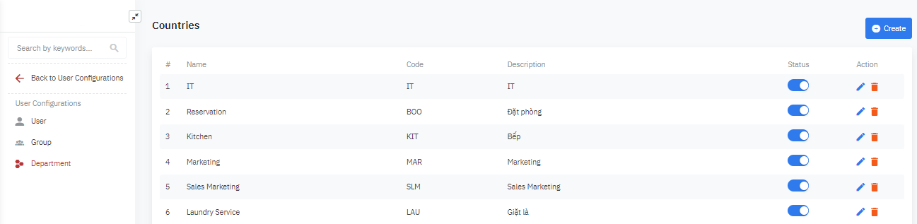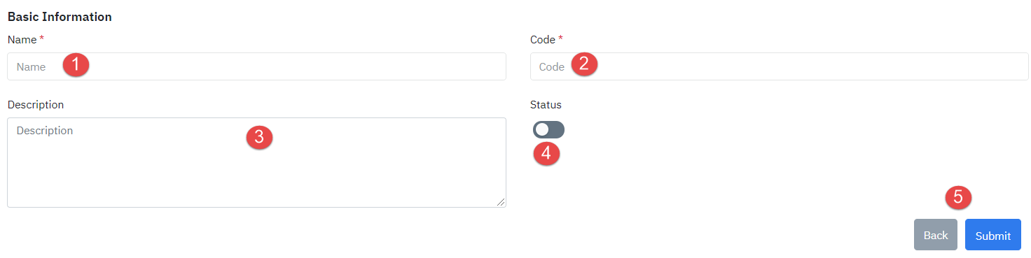 Click ចូល “Create” >> អេក្រង់បង្ហាញ ![]() (1) ដាក់ឈ្មោះឱ្យនាយកដ្ឋាន/Deparment (2) បង្កើតកូដ/Code (3) ពិពណ៌នា/ Description សម្រាប់នាយកដ្ឋាន (4) បើកស្ថានភាពដំណើរការរបស់នាយកដ្ឋាន (5) ចុច ផ្ញើ/Submit ឬត្រឡប់មកវិញ/Back |