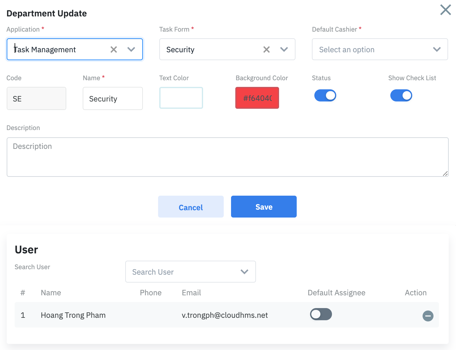 3. Edit Department ( កែសម្រួលផ្នែក ):អេក្រង់កែសម្រួលផ្នែកគឺស្រដៀងនឹងអេក្រង់បង្កើតផ្នែក, អ្នកប្រើប្រាស់អាចផ្លាស់ប្តូរព័ត៌មានរបស់ផ្នែក, បន្ថែម ឬលុបបុគ្គលិកនៅក្នុងផ្នែកអាស្រ័យលើប្រតិបត្តិការជាក់ស្តែងរបស់សណ្ឋាគារ ![]() 4. Delete Department ( លុបផ្នែក ):![]() នៅពេលអ្នកប្រើប្រាស់ចុចប៊ូតុង Delete នៅជួរឈរ Action, ប្រព័ន្ធនឹងបង្ហាញផ្ទាំងជូនដំណឹងសម្រាប់អ្នកប្រើប្រាស់ដើម្បីបញ្ជាក់ពីការលុបផ្នែកខាងក្នុង Task Management |
