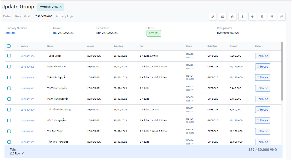 Log in - Front Office - Group Reservation - ជ្រើសរើសក្រុមហើយចុច “Edit” - នៅ Tab Reservation |