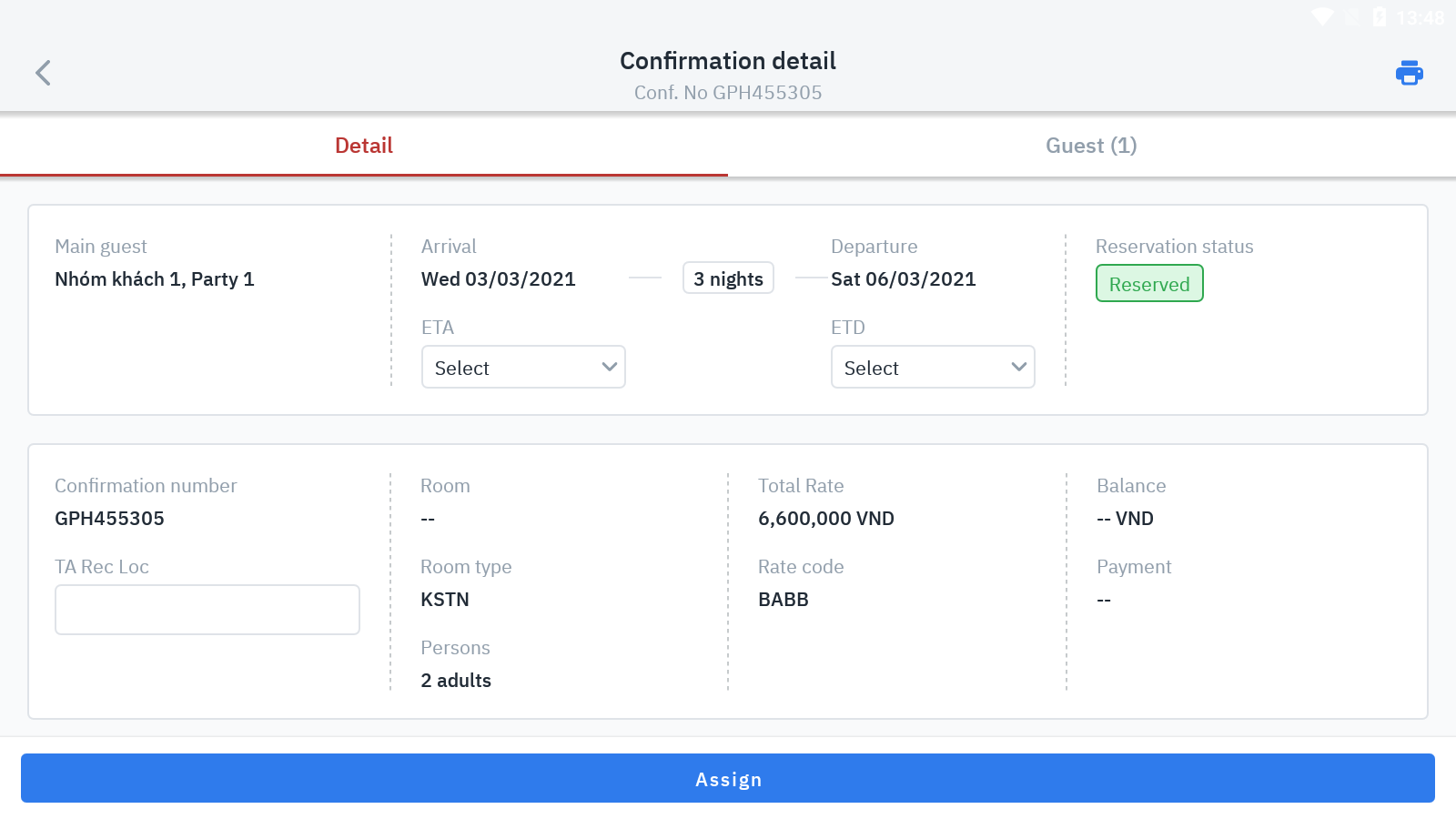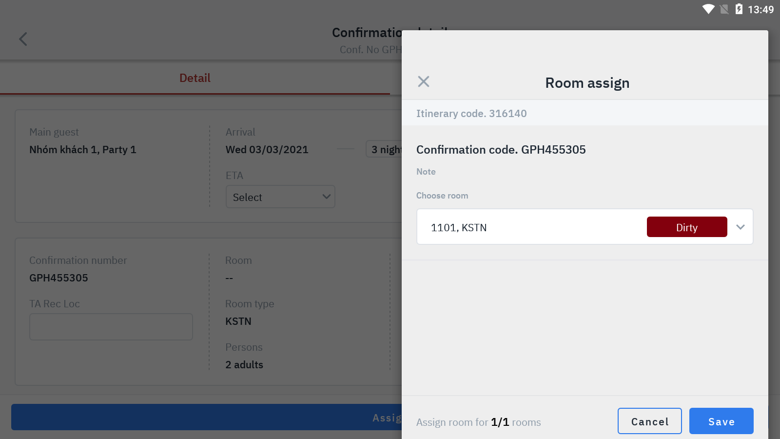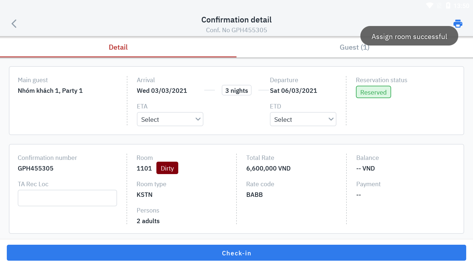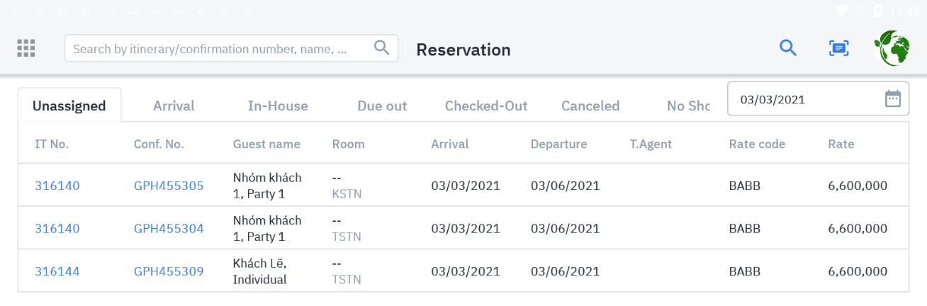ការកក់បន្ទប់ត្រូវបានចាត់តាំងបន្ទប់ដោយជោគជ័យនៅ Tab “Unassigned” នឹងធ្វើបច្ចុប្បន្នភាពដោយស្វ័យប្រវត្តិលេខបន្ទប់ទៅ Tab “Arrival” |