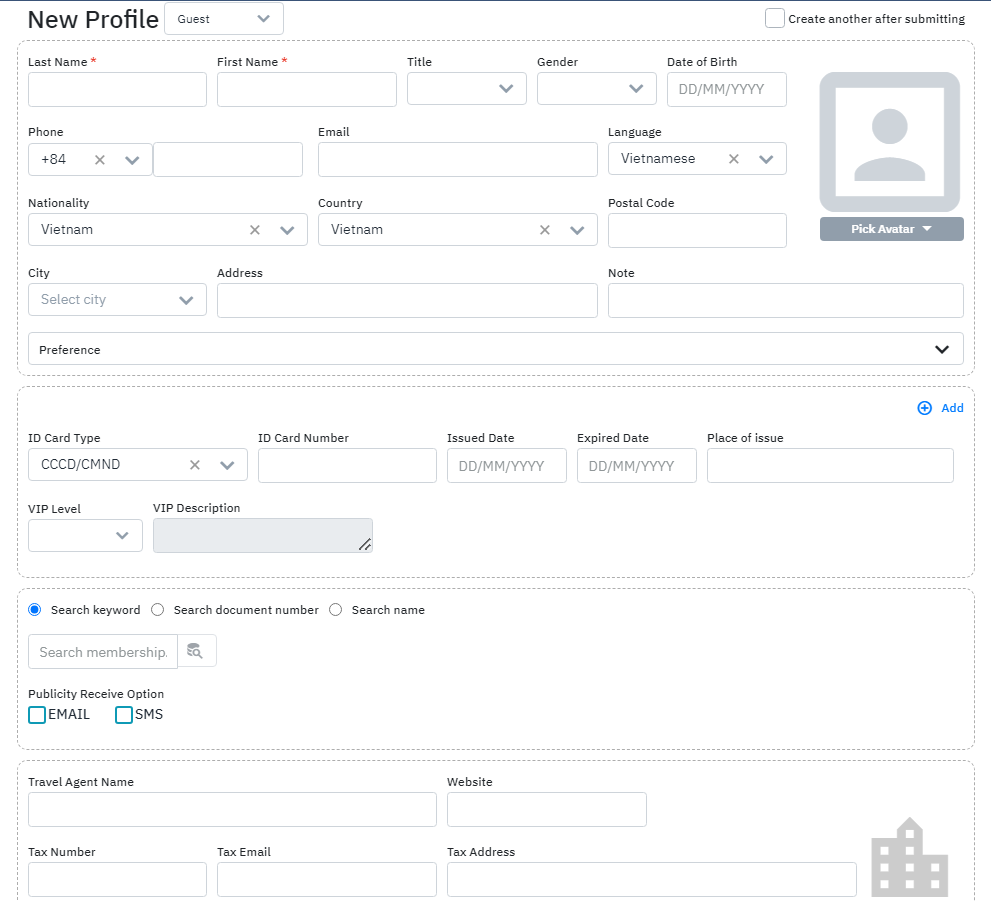 Log in – Front Office – ស្វែងរកកម្រងព័ត៌មានភ្ញៀវ (Profiles) – ចុចជ្រើសរើស icon CREATE នៅជ្រុងខាងស្តាំនៃអេក្រង់ - New profile ជ្រើស type Guest![]() |