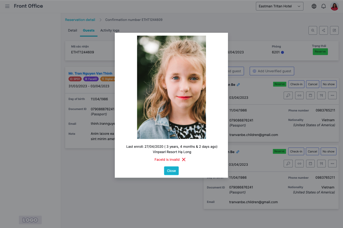 ![]() ជាមួយរាល់ Guest ដែល link profile ឈ្មោះរបស់ភ្ញៀវត្រូវបាន ឡើងជាពណ៌ខៀវដិត (អាចចុចលើឈ្មោះភ្ញៀវដើម្បីមើល profile), រាល់ភ្ញៀវមិនទាន់ link នឹងមានពណ៌ខ្មៅ. ![]() FaceId របស់ភ្ញៀវនឹងត្រូវបានរក្សាទុក profile គ្រាន់តែទៅតាម booking. ជាមួយ returned guest, គ្រាន់តែ link profile នឹងមាន faceId (អាចប្រើបាននៅក្នុងភោជនីយដ្ឋាន, ACM, VAP/SAF/MUD) មិនចាំបាច់ enroll វិញ. |