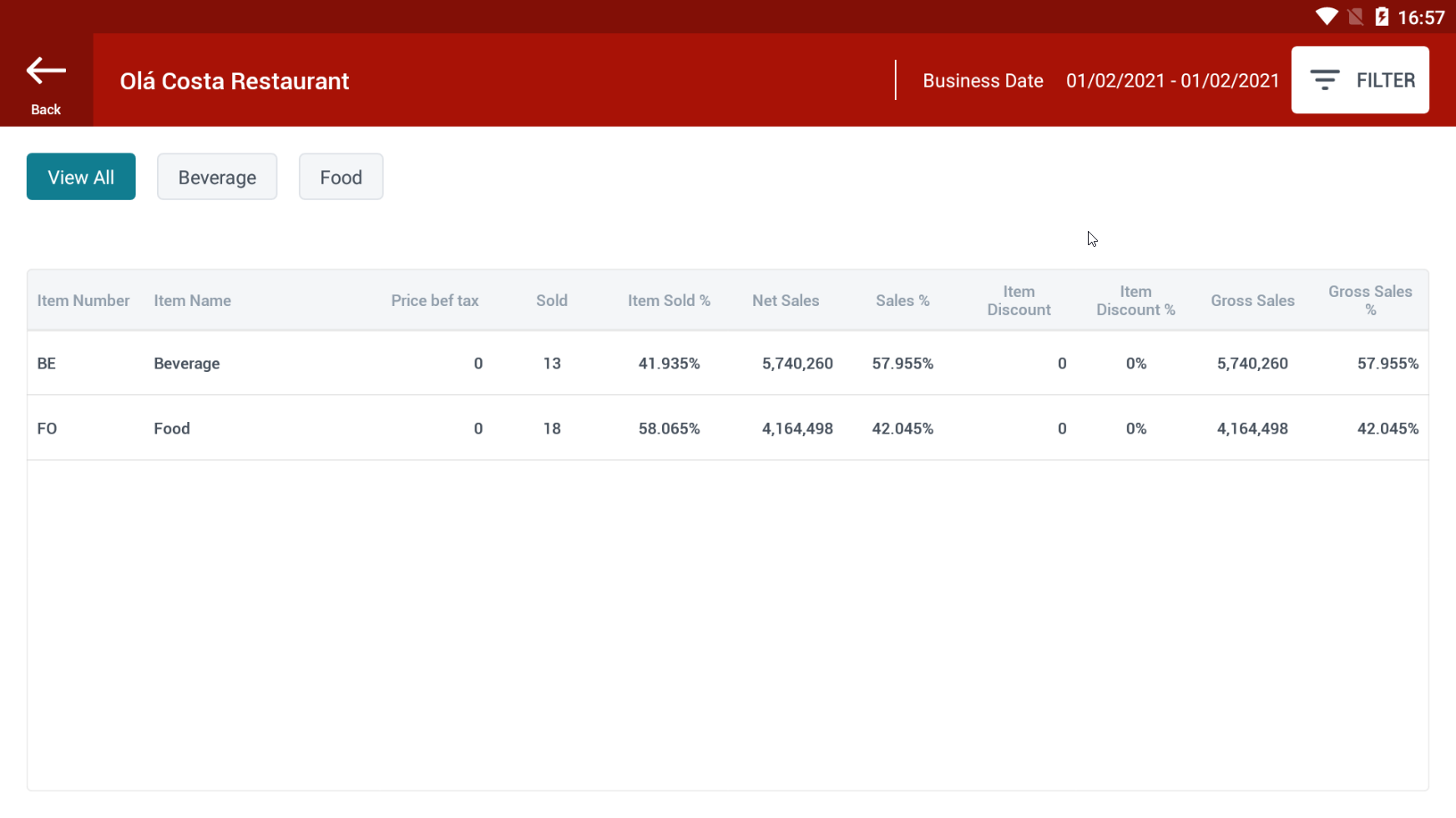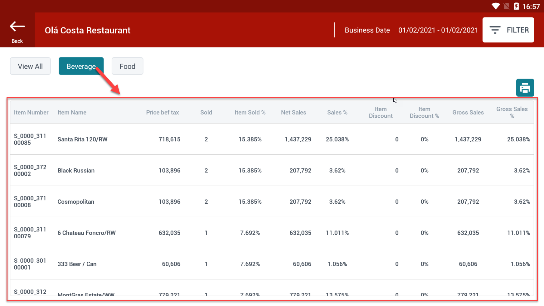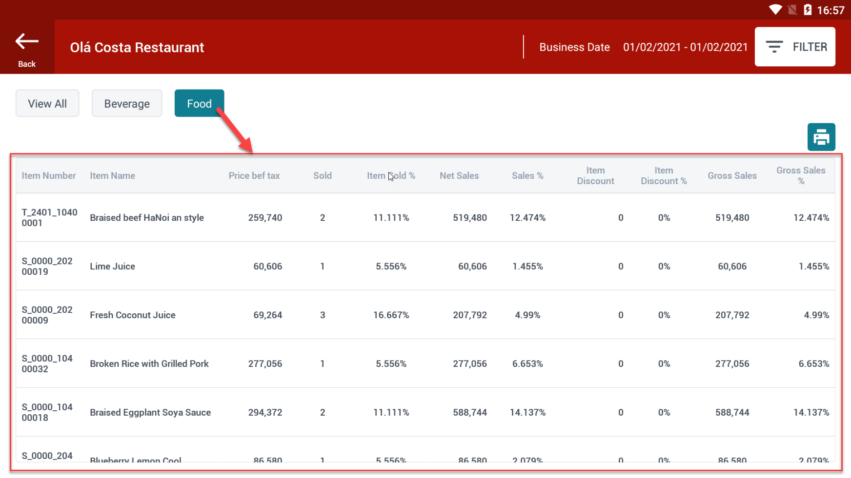 ការពិពណ៌នាអំពីវាលព័ត៌មានដែលបានបង្ហាញ៖ តារាងស្ថិតិសង្ខេបនៃមុខទំនិញដែលបានលក់តាមឈ្មោះក្រុមមុខទំនិញ៖ ![]() វាលព័ត៌មាននៅក្នុងរបាយការណ៍: Item No: លេខកូដក្រុមមុខទំនិញ Item Name: ឈ្មោះក្រុមមុខទំនិញ Price bef tax: តម្លៃមុនពន្ធ Sold: សរុបចំនួននៃទំនិញដែលបានលក់នៅក្នុងក្រុមនេះ Item Sold %: សមាមាត្រនៃបរិមាណសរុបនៃក្រុមមុខទំនិញនេះដែលបានលក់ធៀបនឹងក្រុមមុខទំនិញផ្សេង Net Sales: សរុបចំនួនដែលបានលក់បន្ទាប់ពីបង់ពន្ធ Sales %: សមាមាត្រនៃចំនួនទឹកប្រាក់សរុបដែលបានលក់របស់ក្រុមមុខទំនិញនេះធៀបនឹងក្រុមមុខទំនិញផ្សេង Item Discount: សរុបចំនួនបានការបញ្ចុះតម្លៃ Item Discount %: សមាមាត្រនៃសរុបចំនួនទឹកប្រាក់បញ្ចុះតម្លៃនៃក្រុមនេះធៀបនឹងក្រុមផ្សេង Gross Sales: សរុបចំនួនដែលបានលក់បន្ទាប់ពីការបញ្ចុះតម្លៃ Gross Sales %: សមាមាត្រនៃសរុបចំនួនទឹកប្រាក់ដែលបានលក់បន្ទាប់ពីការបញ្ចុះតម្លៃនៃក្រុមនេះធៀបនឹងក្រុមផ្សេងទៀត តារាងលម្អិតនៃមុខទំនិញដែលបានលក់នៅក្នុងក្រុមមុខទំនិញ “Beverage”: ![]() តារាងលម្អិតនៃមុខទំនិញដែលបានលក់នៅក្នុងក្រុមមុខទំនិញ “Food”: ![]() វាលព័ត៌មាននៅក្នុងរបាយការណ៍: Item No: លេខកូដមុខទំនិញ Item Name: ឈ្មោះមុខទំនិញ Price bef tax: តម្លៃមុនពេលបង់ពន្ធ Sold: សរុបចំនួនបរិមាណទំនិញដែលលក់ក្នុងក្រុមនេះ Item Sold %: សមាមាត្រនៃបរិមាណសរុបនៃមុខទំនិញនេះដែលបានលក់បើប្រៀបធៀបទៅនឹងមុខទំនិញផ្សេងទៀត Net Sales: សរុបចំនួនទឹកប្រាក់ដែលបានលក់បន្ទាប់ពីបង់ពន្ធ Sales %: សមាមាត្រនៃសរុបចំនួនទឹកប្រាក់ដែលបានលក់នៃមុខទំនិញនេះបើប្រៀបធៀបទៅនឹងទំនិញផ្សេងទៀត។ Item Discount: សរុបចំនួនទឹកប្រាក់បានបញ្ចុះតម្លៃ Item Discount %: សមាមាត្រនៃសរុបចំនួនទឹកប្រាក់បញ្ចុះតម្លៃនៃមុខទំនិញនេះបើប្រៀបធៀបទៅនឹងមុខទំនិញផ្សេងទៀត។ Gross Sales: សរុបចំនួនទឹកប្រាក់ដែលបានលក់បន្ទាប់ពីការបញ្ចុះតម្លៃ Gross Sales %: សមាមាត្រនៃសរុបចំនួនដែលបានលក់បន្ទាប់ពីការបញ្ចុះតម្លៃនៃមុខទំនិញនេះបើប្រៀបធៀបទៅនឹងទំនិញផ្សេងទៀត។ ![]() ចុចលើរូបតំណាងម៉ាស៊ីនបោះពុម្ពនេះ ដើម្បីបោះពុម្ពរបាយការណ៍ទៅកាន់ម៉ាស៊ីនបោះពុម្ពកម្ដៅដែលបានភ្ជាប់នៅលើតួម៉ាស៊ីន។ |
