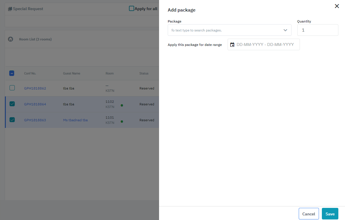Cancel: Cancel រាល់បន្ទប់ដែលបានជ្រើសរើសស្ថិតក្នុងស្ថានភាពបញ្ជាក់