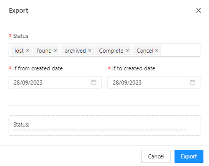 2. ចេញរបាយការណ៍/Export: ចេញរបាយការណ៍ដើម្បីកត់សម្គាល់ព័ត៌មានអំពីវត្ថុដែលបាត់![]() អនុវត្តរបាយការណ៍ដោយយោងទៅតាមស្ថានភាពនៃវត្ថុដែលបាត់បង់ដូចជា៖: រកឃើញ, បាត់, រក្សារទុក, បានបញ្ចប់ ឬលុបចោលដែលត្រូវនឹងកាលបរិច្ឆេទបង្កើត យោងទៅតាមដំណាក់កាលដែលអ្នកប្រើប្រាស់ត្រូវការស្វែងរក 3. បញ្ចូលទិន្នន័យ/Importអនុញ្ញាតឱ្យបញ្ចូលដំណើរគ្នាមួយចំនួនច្រើននៃព័ត៌មានវត្ថុដែលបាត់ តាមទម្រង់ template |