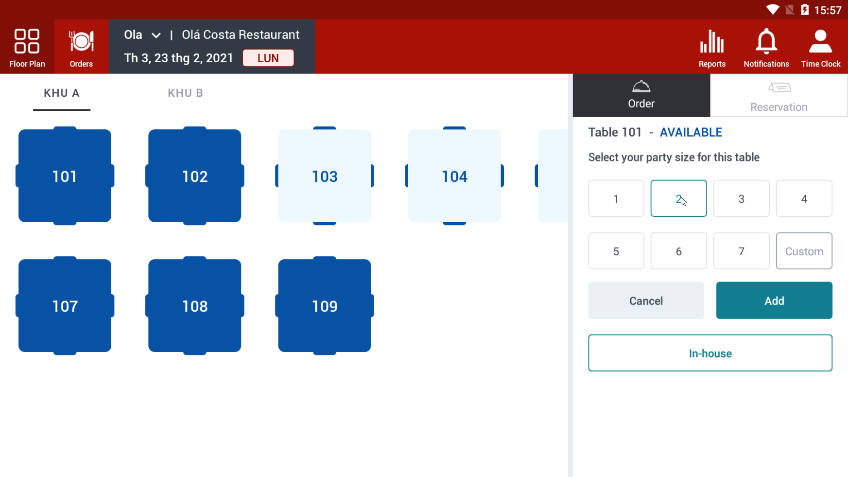 ![]() ជំហាន 1: ជ្រើសរើសតុទទេដើម្បីបង្កើតការបញ្ជាទិញថ្មី - បើសិនភ្ញៀវ Outside -> ជ្រើសរើសចំនួនភ្ញៀវនៅតុ - បើសិនភ្ញៀវ In-House -> ជ្រើសរើស In-house ដើម្បីបញ្ចូលព័ត៌មានភ្ញៀវ In-house នៅក្នុងអេក្រង់ខាងក្រោម: ![]() Room: បញ្ចូលលេខបន្ទប់ Name: ឈ្មោះភ្ញៀវ (ទាញយកដោយស្វ័យប្រវត្តិ PMS តាមរយៈលេខបន្ទប់) No. of people: បញ្ចូលចំនួនភ្ញៀវនៅតុ Nationality: សញ្ជាតិរបស់ភ្ញៀវ (ទាញយកដោយស្វ័យប្រវត្តិពី PMS តាមរយៈលេខបន្ទប់) Unable to Room Charge/ Able to Room Charge: មិនបាន/ ត្រូវបានអនុញ្ញាតការទូទាត់តាមរយៈទម្រង់ Room Charge (ទាញយកព័ត៌មានដោយស្វ័យប្រវត្តិពី PMS តាមរយៈលេខបន្ទប់) ជំហាន 2: Click Add ដើម្បីបង្កើតការបញ្ជាទិញ |