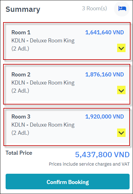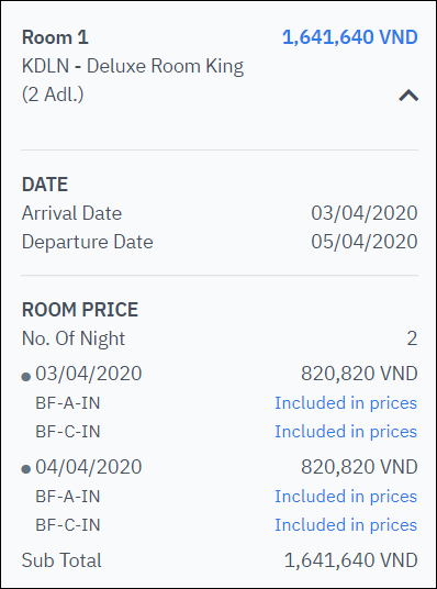 ក្នុងករណីដែលកញ្ចប់សេវាកម្មអនុវត្តចំពោះរយៈពេលភ្ញៀវស្នាក់នៅទាំងមូល។ អ្នកប្រើប្រាស់ចុច“Apply for all days” ដើម្បីអនុវត្តកញ្ចប់សេវាកម្មសម្រាប់រយៈពេលស្នាក់នៅទាំងមូល។ ផ្នែកទី 2: [Summary] – ព័ត៌មានរួមបង្ហាញបញ្ជីនៃការកក់ដែលបានបង្កើតបច្ចុប្បន្ន។ ចុចលើសញ្ញាព្រួញដើម្បីមើលព័ត៌មានលម្អិតសម្រាប់ការកក់បន្ទប់នីមួយៗ ![]() ព័ត៌មានលម្អិតសម្រាប់ការកក់នីមួយៗ៖ ![]()