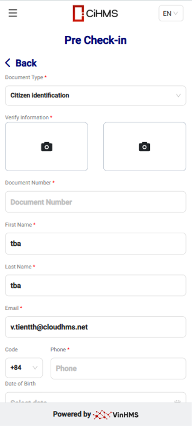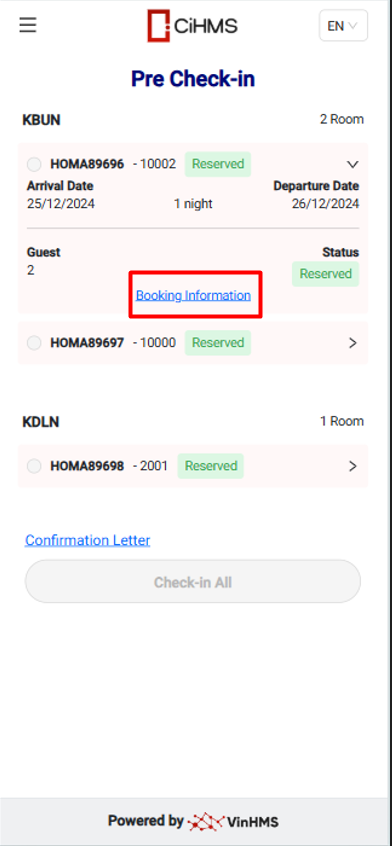 After updating the guest's profile information, click the "Pre-checkin" button to pre-checkin the guest's booking/បន្ទាប់ពីធ្វើបច្ចុប្បន្នភាពព័ត៌មានប្រវត្តិរូបរបស់ភ្ញៀវ សូមចុចប៊ូតុង "Pre-checkin" ដើម្បីបំពេញការចូលមុនសម្រាប់ការកក់របស់ភ្ញៀវ។. ![]()