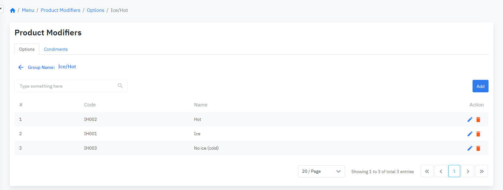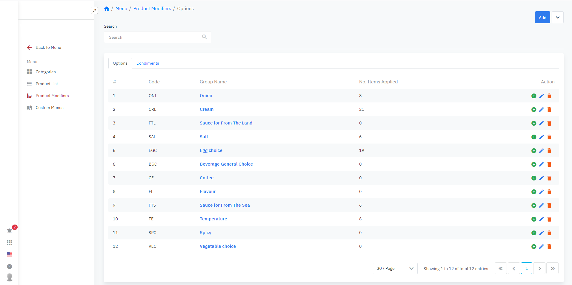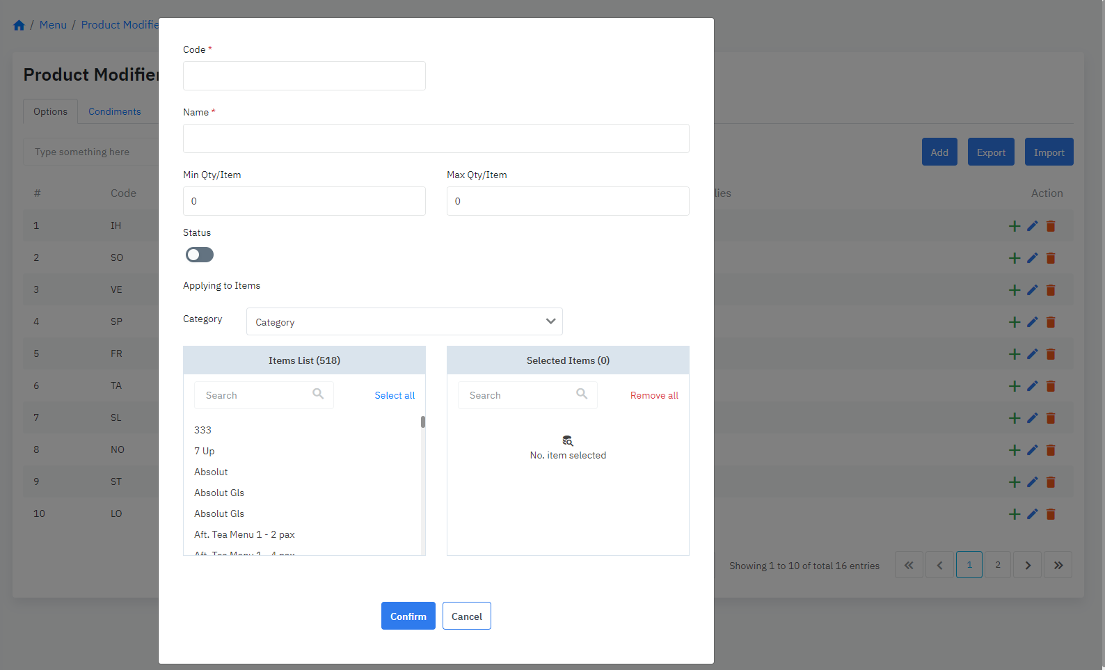 Log in – Food and Beverage - Menu - Product Modifiers - Options |
