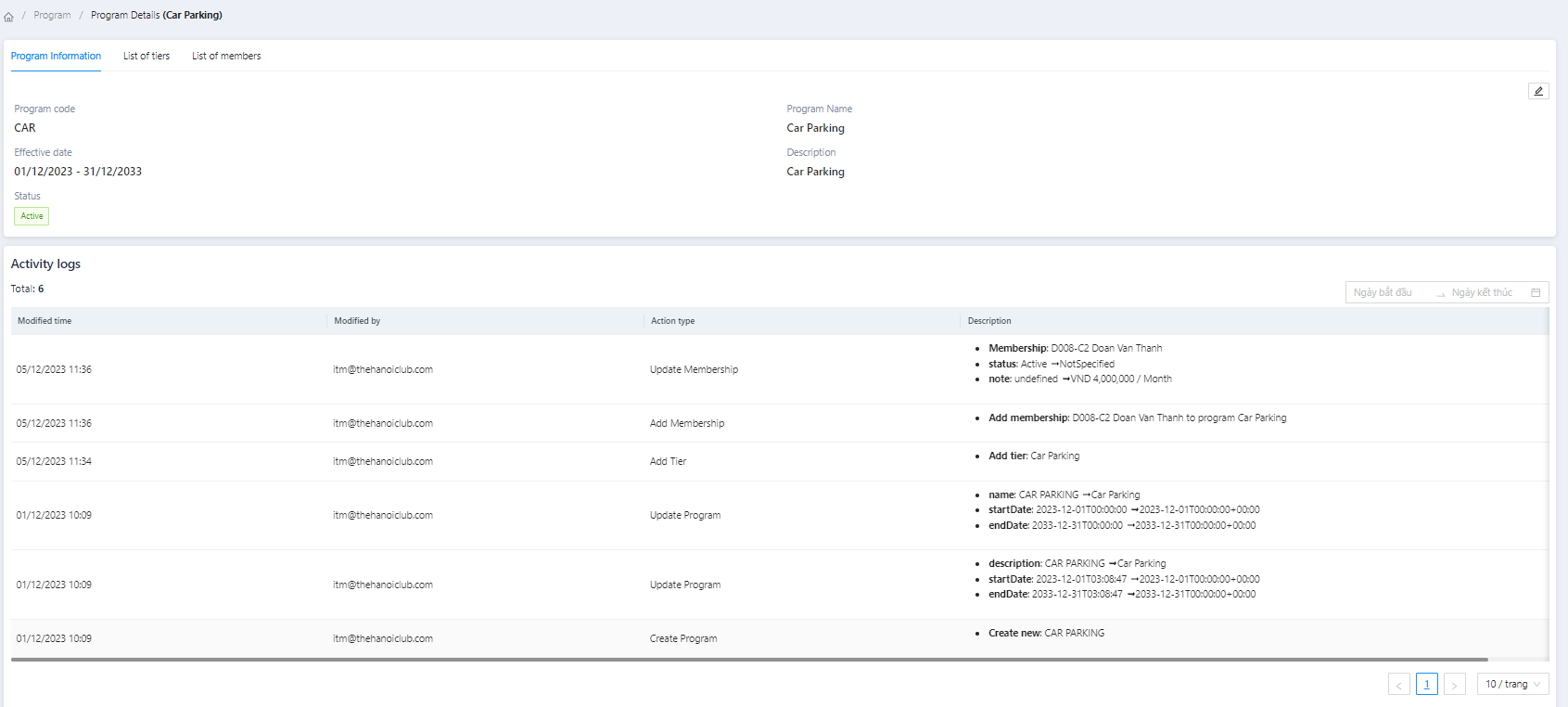 ជ្រើសរើស Search ដើម្បីស្វែងរក [Create New] – បង្កើតកម្មវិធីថ្មី![]() ចំណាំ: រាល់វាលព័ត៌មានមានសញ្ញា * ចាំបាច់ត្រូវបំពេញគ្រប់, ចុចជ្រើសរើស Confirm ដើម្បីបញ្ចប់ការបង្កើតកម្មវិធីថ្មី [Detail] – សូមមើលព័ត៌មានលម្អិតអំពីសកម្មភាពកម្មវិធី![]() [Tab Program information] – ព័ត៌មានកម្មវិធីអនុញ្ញាតឱ្យអ្នកប្រើពិនិត្យ Activities log/ ប្រវត្តិសកម្មភាពរបស់កម្មវិធីរួមមានព័ត៌មានដូចខាងក្រោម៖