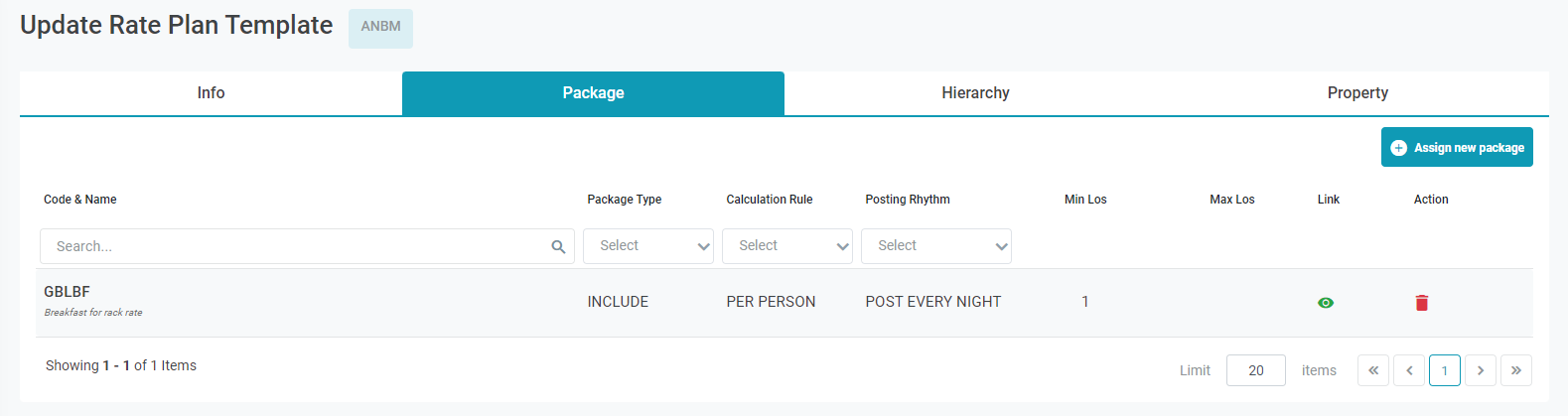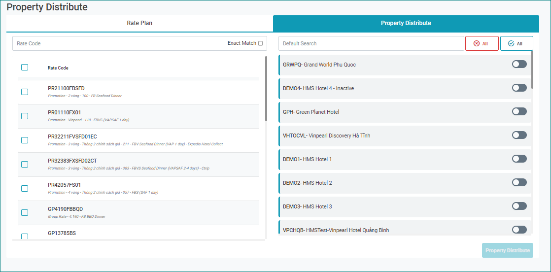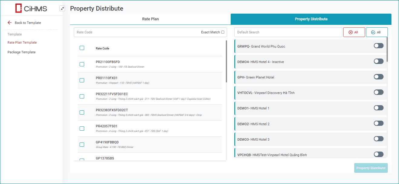 រក្សា/Submit: ចុចដើម្បីបង្កើតកូដតម្លៃបន្ទប់ថ្មី ហើយនឹងទៅទំព័រលម្អិតនៃលេខកូដតម្លៃបន្ទប់ដែលទើបបង្កើតថ្មី [Assign Package] - ចាត់តាំង Global Package ចូល Global Rate ចុចប៊ូតុងកែសម្រួល Rate Code Global, ចូល tab Packages. ដើម្បីដកមួយ package ឱ្យ Rate, អ្នកប្រើប្រាស់នឹងជ្រើសរើសរូបតំណាងធុងសំរាម ![]() [Import Rate Plan Template] - បញ្ចូលទិន្នន័យស្របតាម template ![]() អ្នកប្រើអាចប្រើប្រាស់ template ដើម្បីបញ្ចូលទិន្នន័យបង្កើតលេខកូដតម្លៃបន្ទប់ template គំរូខាងក្រោម 20201103 - Sample Global Rate.xlsx II. Property Distribute - ការបែងចែក Rate Global ទៅ Property![]()