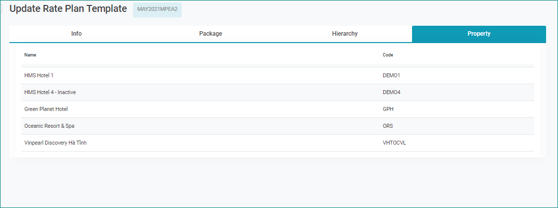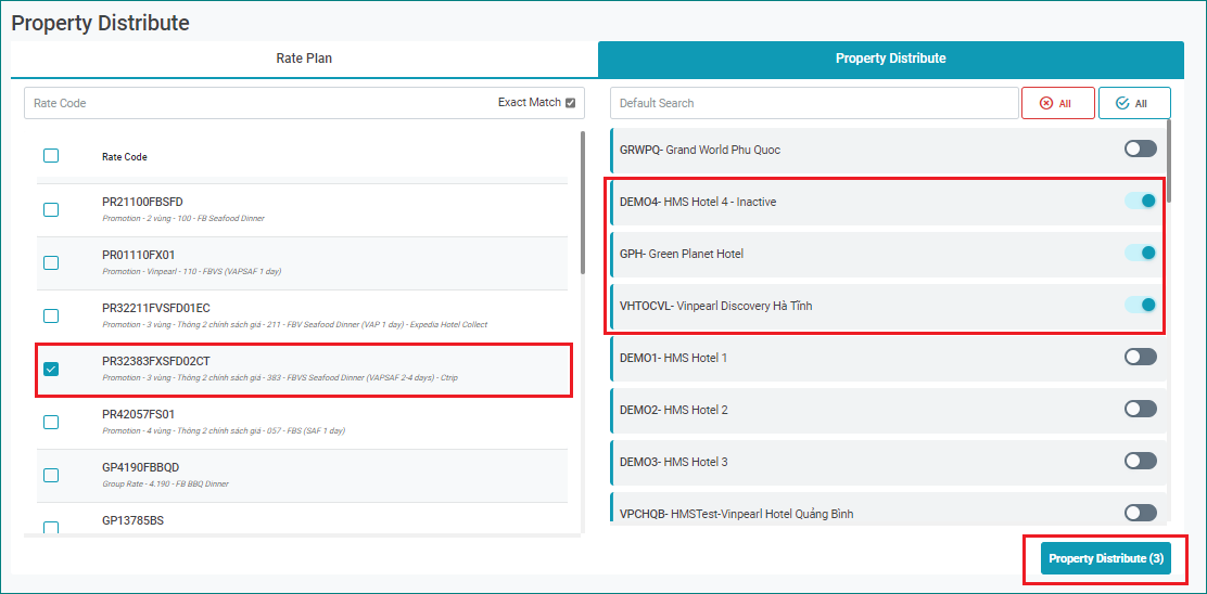 បន្ទាប់ពីចុច “ Property Distribute” អេក្រង់ Update Rate Plan Template របស់ Rate ត្រូវគ្នា មាន Tab “Property” បង្ហាញ “3” Property ដែលត្រូវគ្នាបាន Public ![]() |