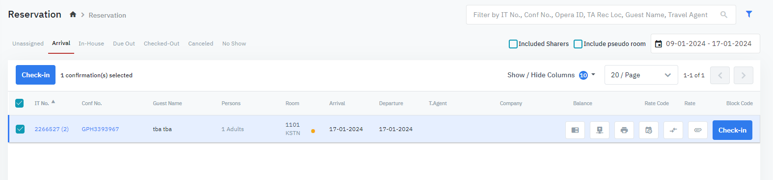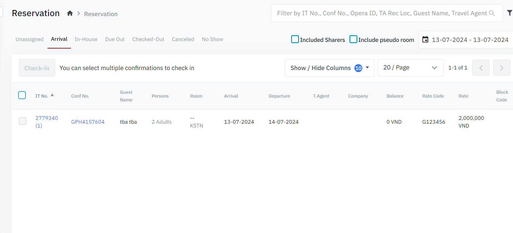 នៅពេលចុចជ្រើសរើសការកក់បន្ទប់ 1 នៅ Arrivals, ប្រអប់ Check-in នឹងភ្លឺឡើង ហើយអនុញ្ញាតឱ្យអ្នកប្រើប្រាស់ធ្វើការ Check-in នៅអេក្រង់នេះ។ អ្នកអាចជ្រើសរើសការកក់ច្រើនក្នុងពេលតែមួយ។