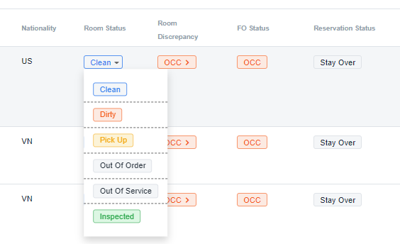 អ្នកប្រើប្រាស់អាចធ្វើប្រតិបត្តិការដើម្បីផ្លាស់ប្តូរស្ថានភាពបន្ទប់ (Room Status) ឬស្ថានភាពខុស (Room Discrepancy នៅលើអេក្រង់ Room Management![]()