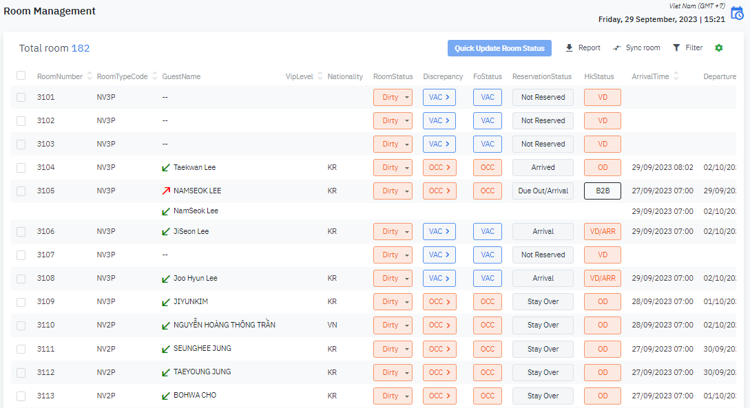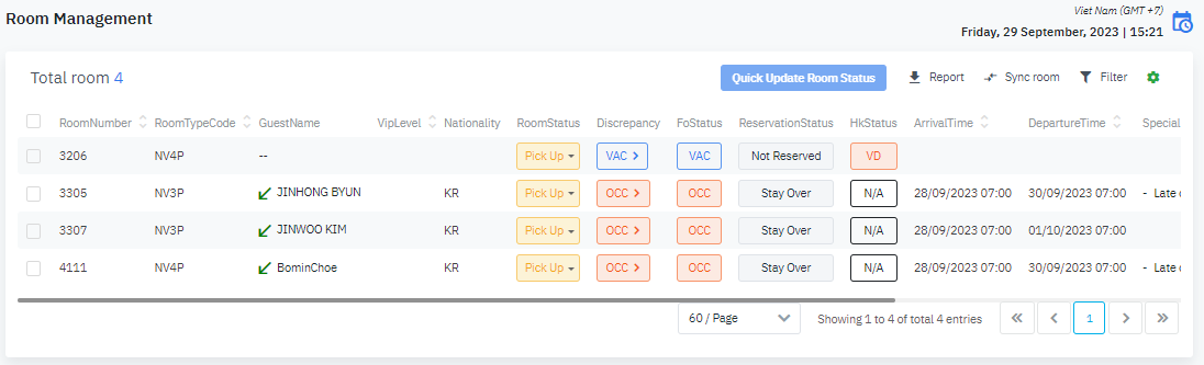 ស្វែងរក និងគ្រប់គ្រងព័ត៌មានលម្អិតនៃស្ថានភាពបន្ទប់, ធ្វើបច្ចុប្បន្នភាពស្ថានភាពបន្ទប់យ៉ាងរហ័សតាមបន្ទប់ឥវាន់និងចេញបាយការណ៍. |